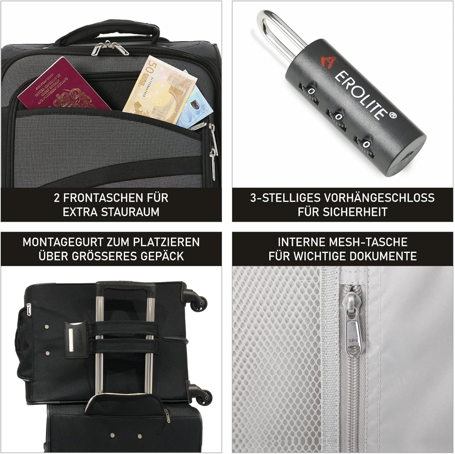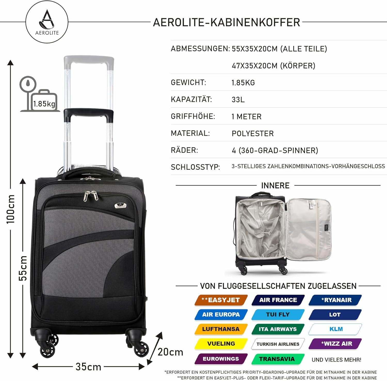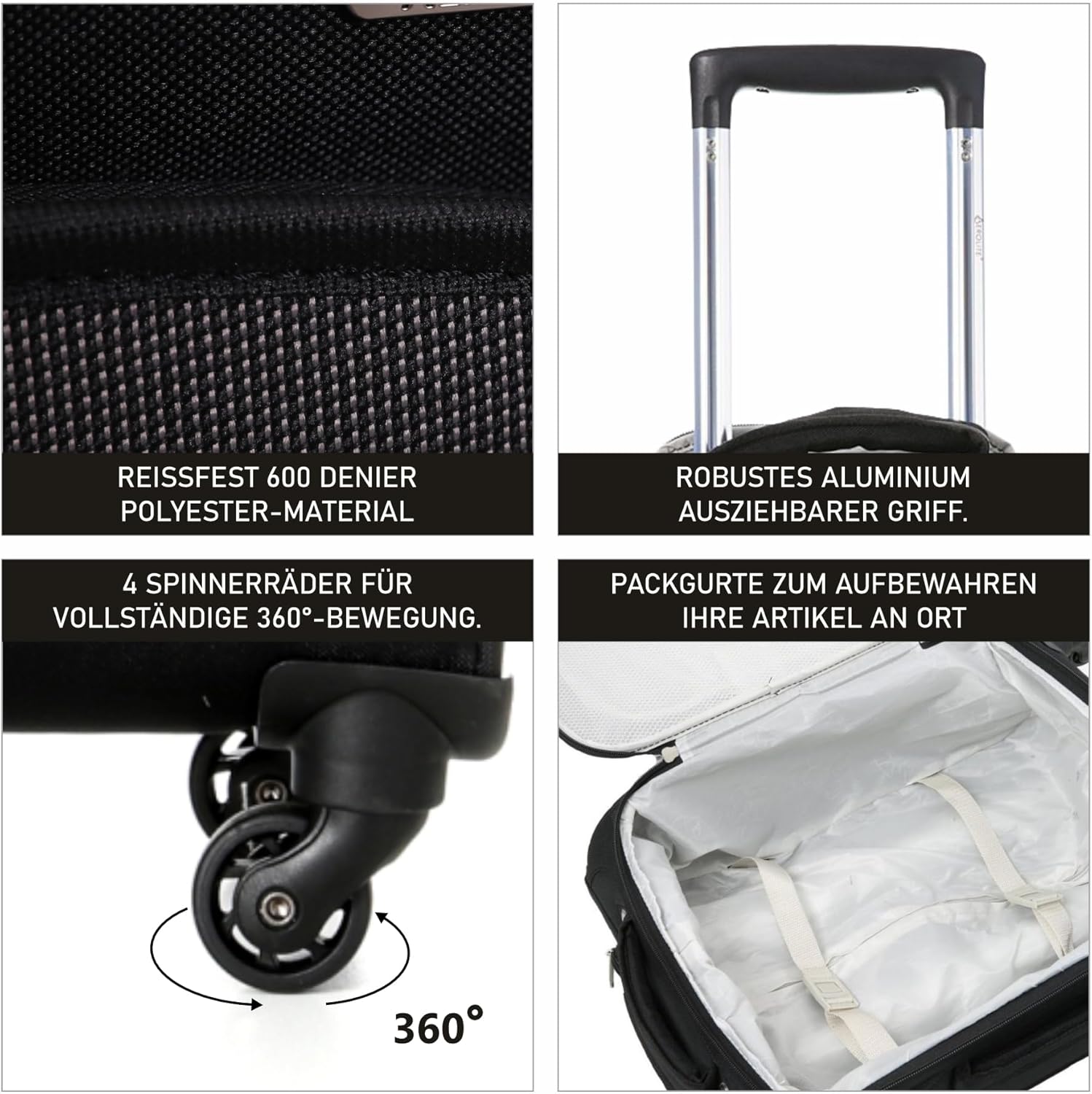 Mit 4 Spinner-Rädern Erstaunliche Fluglinienkompatibilität, einschließlich Ryanair und easyJet Versenkbarer Griff für lange Lebensdauer 3-stelliges Vorhängeschloss Packgurte für die Organisation Zusätzliche Fächer für Dokumente