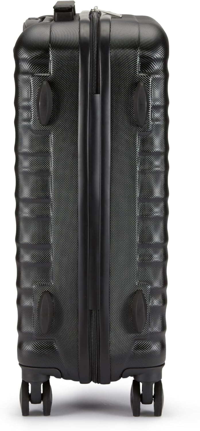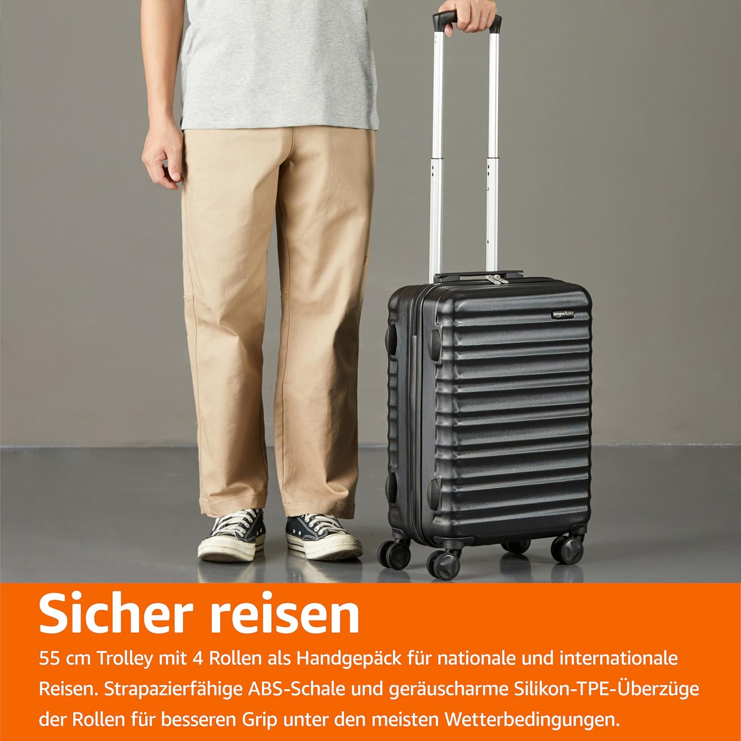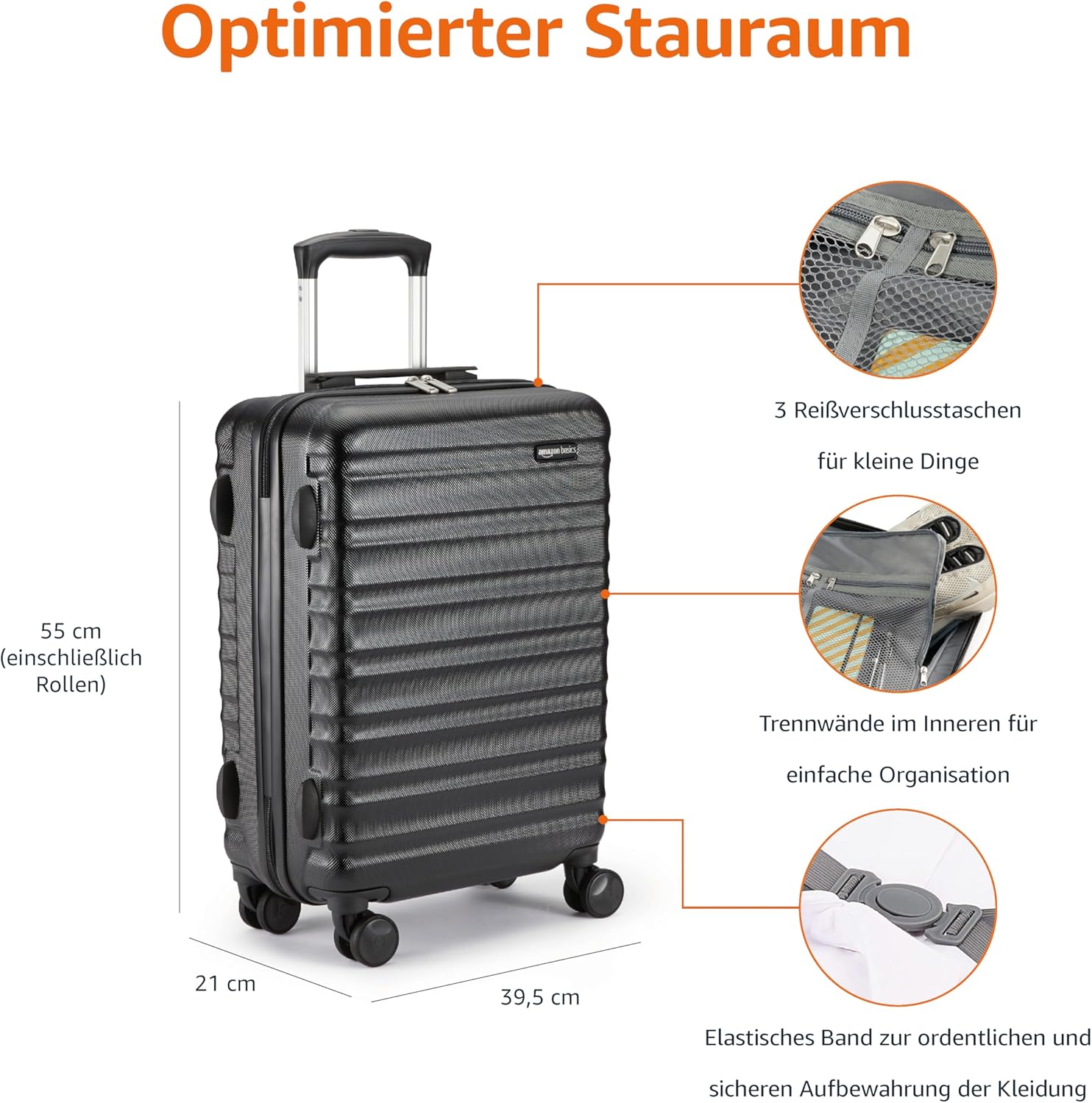 Habe diesen Koffer extra für meinen ersten Flug mit Ryanair bestellt, da die ja streng die Größen für das Handgepäck kontrollieren (Priority-Gepäck).Ich habe einen günstigen Koffer gesucht und mit dem Amazon Basics Koffer gefunden und ich bin positiv überrascht. Der Koffer kam natürlich super schnell an, war ordnungsgemäß verpackt.Koffer hat (wie auf dem Foto zu sehen) eine gute Inneneinrichtung/-Aufteilung.Habe den Koffer für eine volle Woche mitgenommen und die Maße waren bei der Kontrolle kein Problem.Ich habe reinbekommen: Kosmetiktaschen (2 Stück), meinen Glätteisen, meinen Steamer, 3 Kleider, drei Hosen, vier Oberteile, zwei BHs, 7 paar Socken, 7 mal Damenunterwäsche, ein Pyjama, zwei paar Schuhe (Converse und Ballerinas). Auf dem Rückflug konnte ich sogar noch diverses Souvenir und zwei Hosen mehr reinpacken und ein paar Schuhe. Also vollkommen ausreichend, noch angenehmer wenn man natürlich nur Gepäck für 3-4 Tage benötigt.Den Flug, Bus- und Metrofahrten hat der Koffer ohne Probleme bestanden.Die vier Rollen funktionieren einwandfrei und gleiten perfekt mit. Der Ausziehgriff ist höhenverstellbar, und hier kommt auch das einzige „Manko“: man muss ab und zu ein bisschen rütteln damit die Stange einrastet, aber das ist wirklich kein Problem und bei diesem Preis sowieso nicht.Alles in allem ist der Koffer perfekt und hält sicherlich noch ein paar Reisen aus. Guter Stauraum, wirkt sehr robust und ist es auch, das Design Elegant und schlicht. Preis-Leistungsverhältnis unschlagbar.Kann diesen Koffer guten Gewissens weiterempfehlen und werde ihn auch Familie/Freunden ans Herz legen, die einen Koffer mit diesen Maßen benötigen!