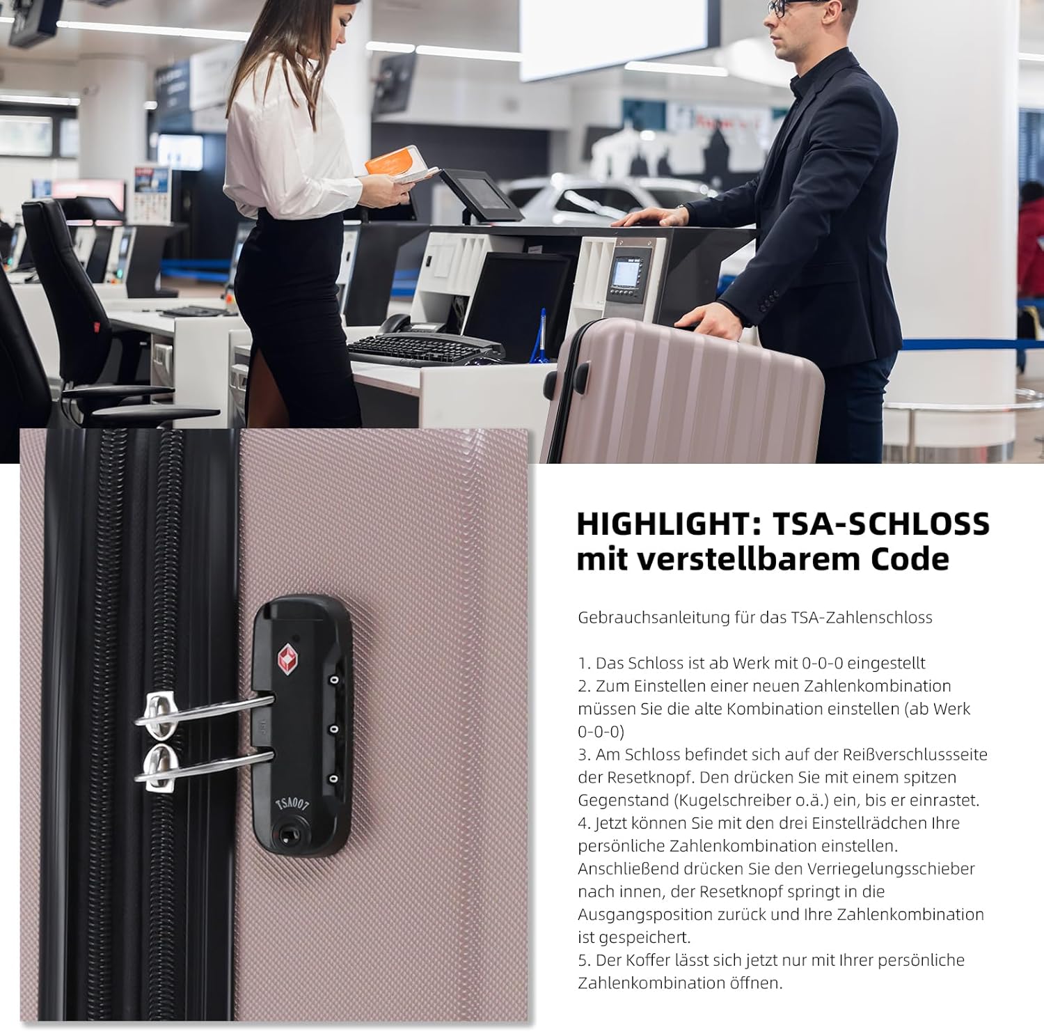 TSA-Code-Schloss: Die Kombination aus einem TSA-Code-Schloss und einem Seitengriff ist eine praktische und sichere Lösung für einen Koffer. Das TSA-Schloss ermöglicht eine reibungslose Sicherheitskontrolle des Gepäcks, während der Seitengriff die Handhabung des Koffers komfortabler gestaltet.