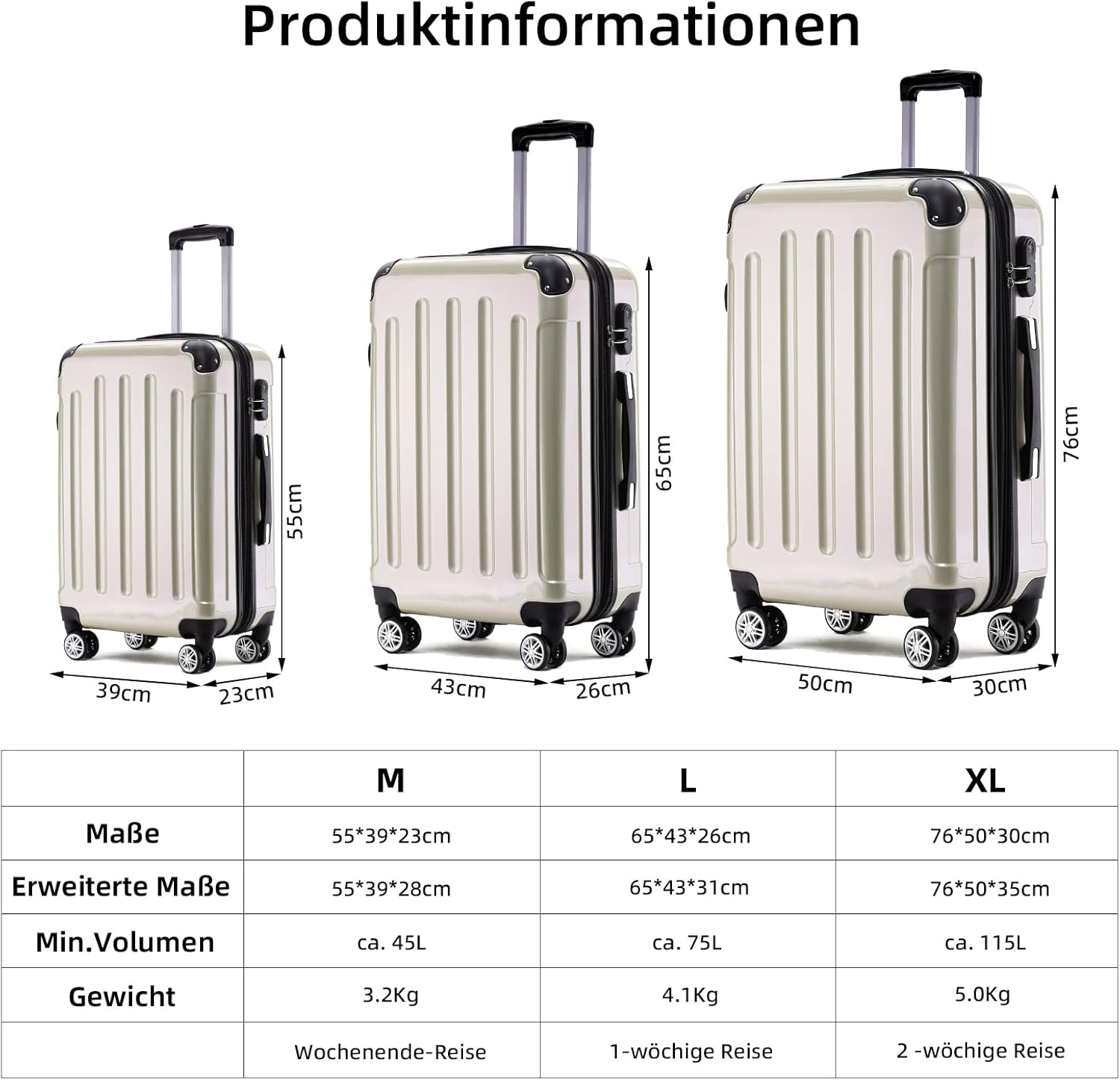 GERINGER PREIS MIT ZWEI JAHREN GARANTIE !KOFFER FÜR JEDE: Größe XL: 76x50x30 cm, Gewicht: 5,2 kg; Größe L: 67x43x26 cm, Gewicht: 4,1 kg; Größe M (Handgepäck): 55x39x23 cm; Gewicht: 3,2 kg.