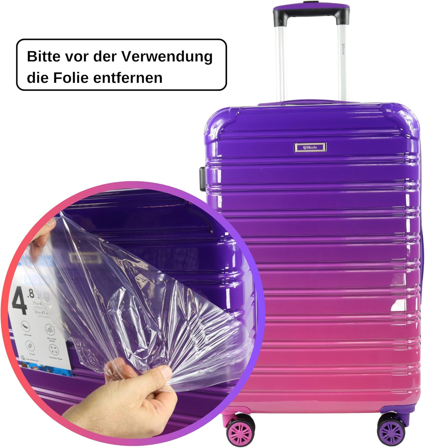 【 SCHUTZFOLIE ENTFERNEN 】Blade Rollkoffer kommt mit einer klaren Schutzfolie, um Kratzer und Flecken vor dem Kauf zu verhindern. Verwenden Sie eine Nadel, um die Schutzfolie an den Kanten Ihres Ful Gepäcks zu lösen, besonders um Griffe und Hartplastikbereiche. Beginnen Sie an einer Kante und ziehen Sie die Folie vorsichtig ab. Halten Sie Nadeln von kleinen Kindern fern.