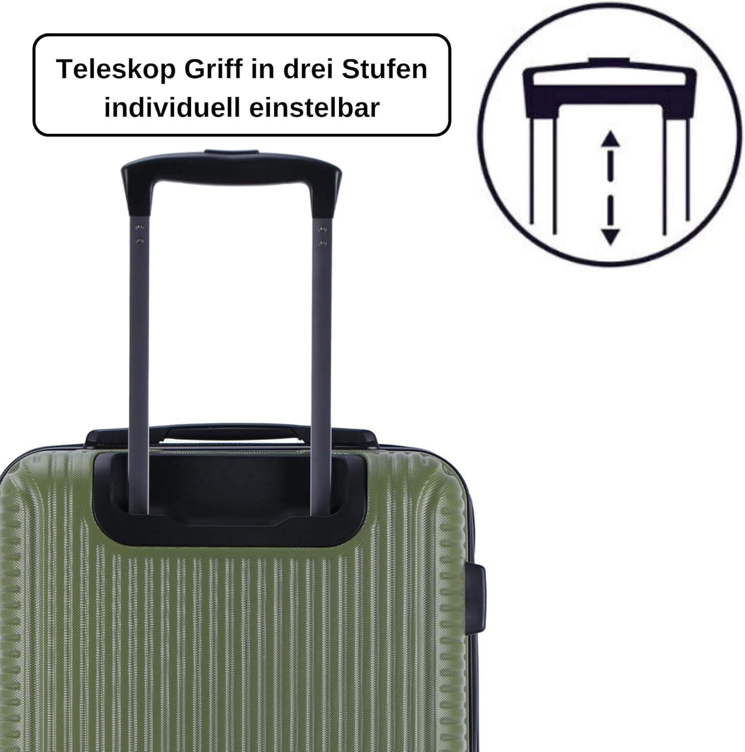 【VERSTELLBARER TELESKOPGRIFF】Der mit einem Druckknopf sicher verriegelbare Griff kann auf unterschiedliche Höhen eingestellt werden, was das Ziehen des Koffers vereinfacht.