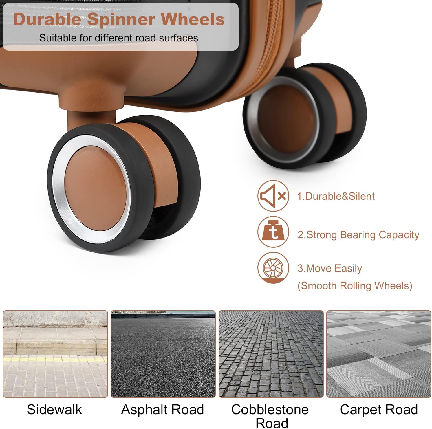 4 doppelte Spinner-Räder bieten 360-Grad-Manövrierbarkeit und lassen Ihren Koffer sanft an Ihrer Seite rollen.