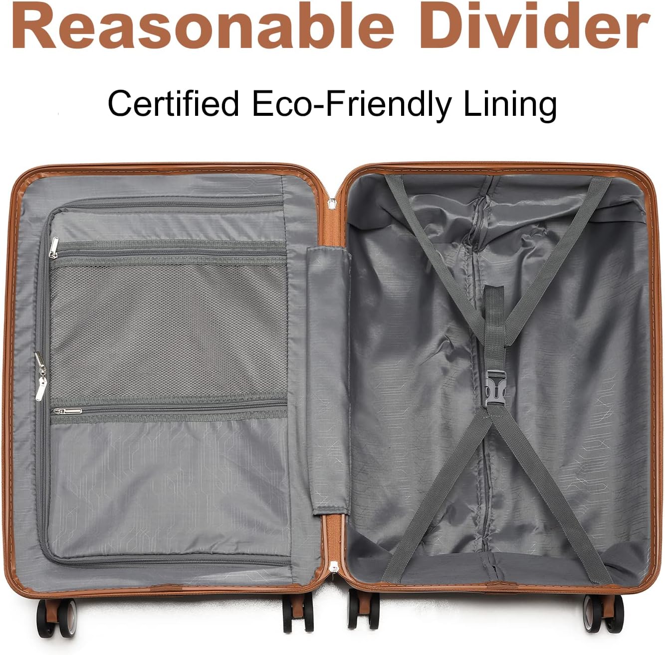 Multifunktionale Innen Struktur – Ein Kreuz-Schnallegurt im Trolleys Koffer für Ihre Sachen zu befestigen, um den Inhalt nicht zu verrutschen. Durch einen flexiblen Zwischenboden mit reißverschluss lässt sich der Innenraum ganz einfach in zwei separate Raum unterteilen. Auf dem Zwischenboden gibt es eine Netztasche und eine geschlossende Tasche, um Ihre Dinge zu separieren. Für unsere Kunden eine beste Komfort zu erhöhen.