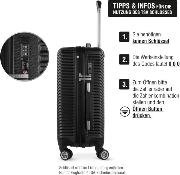 TSA-ZAHLENSCHLOSS – Das TSA-Schloss funktioniert ohne Schlüssel, dieser ist exklusiv für das Flughafenpersonal vorgesehen, um Schäden an Ihrem Gepäck während der Kontrolle zu vermeiden. Eine genaue Bedienungsanleitung ist im Lieferumfang enthalten