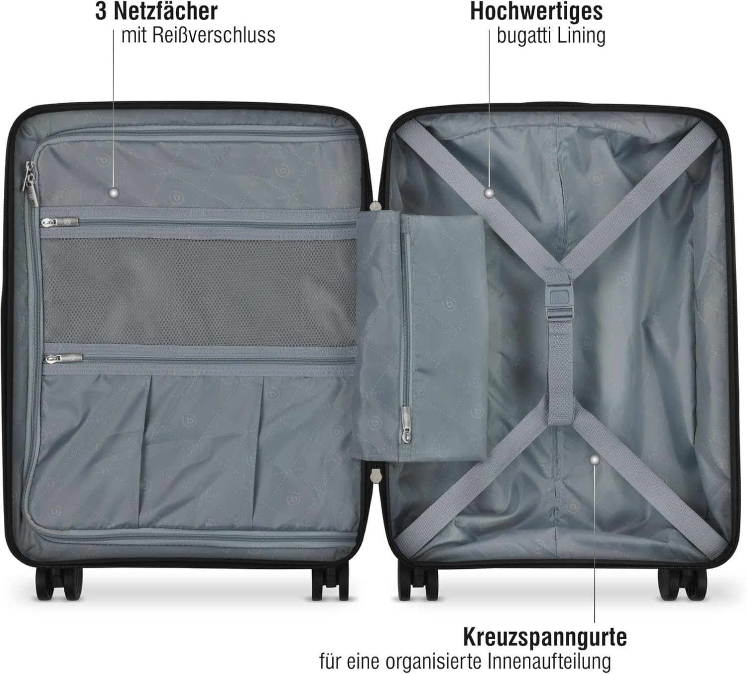 Wir haben ja schon zwei Bugatti-Koffer, aber dieser hier ist noch eine Nummer besser. Wie immer ist die Qualität spitze, er rollt superleicht und das Design ist klasse.