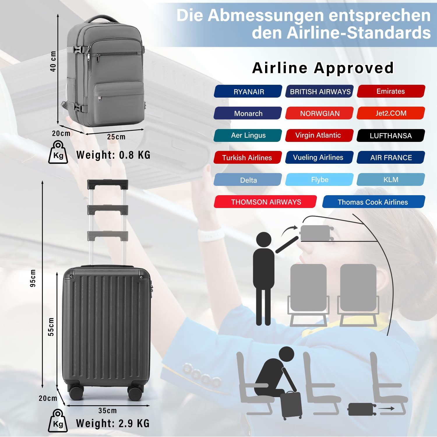 Perfekte Größe für den Kabinenrucksack: Mit den Maßen 40 x 25 x 20 cm entspricht der Kabinenrucksack perfekt den Handgepäckgrößenstandards von den meisten anderen Fluggesellschaften. Sie können den Kabinenrucksack direkt unter dem Sitz oder im Gepäckfach verstauen. Unser Kabinenrucksack verfügt über mehrere Innenfächer, separate Nass- und Trockentaschen, Computergurte und Ladeanschlüsse, um Ihren Reisebedürfnissen gerecht zu werden, egal ob es sich um eine lange Reise oder eine kurze Reise handelt.