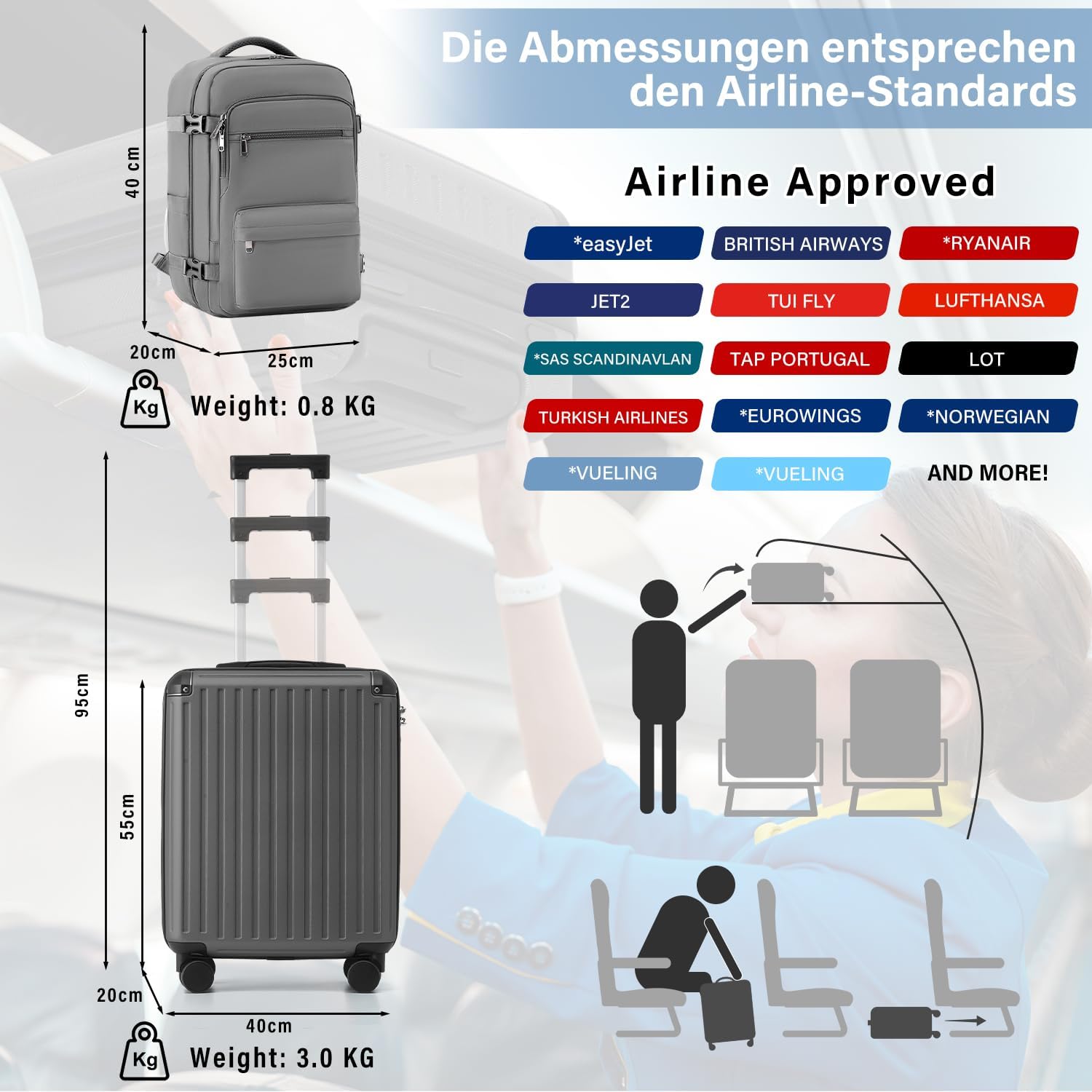 COOLIFE Handgepäck Koffer 55X40X20+Kabinen Rucksack 20L(40X25X20cm) Set für Ryanair & EasyJet Flugzeug Handgepäck