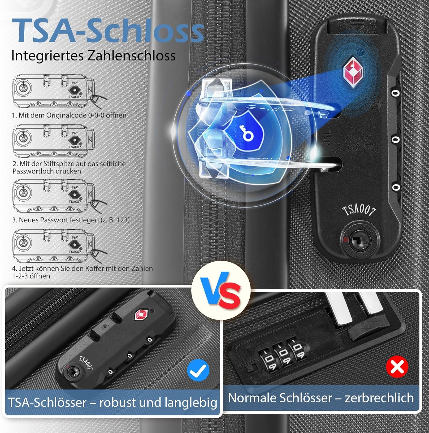 TSA-Schloss: Das integrierte Zahlenschloss ermöglicht das einfache und bequeme Ver- und Entriegeln Ihres Gepäcks während der Reise. Das Gepäckraumschloss ist von Travel Sentry zugelassen, sodass das Transportsicherheitspersonal das Gepäck mit dem offiziellen Hauptschlüssel entriegeln kann, ohne dass es zu Schäden kommt.
