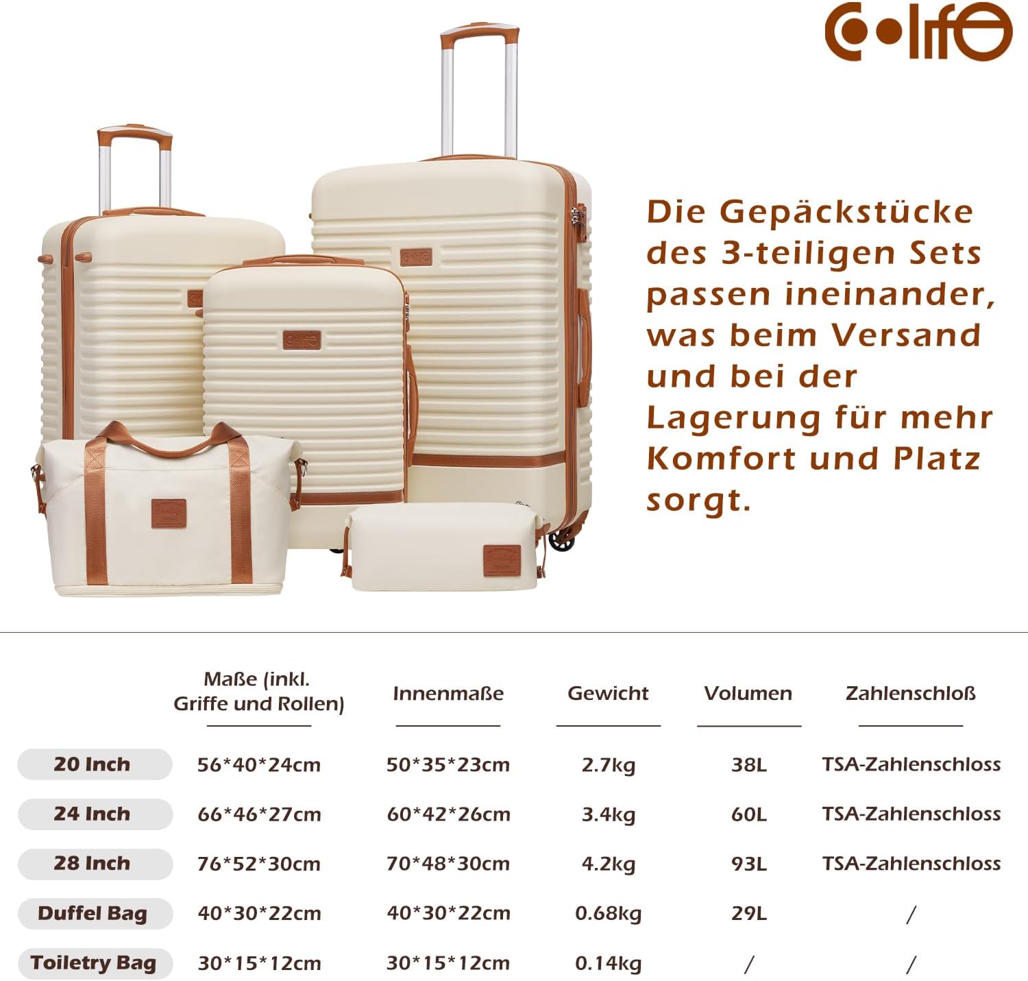 5 teiliges Kofferset: Dieses Reisekofferset enthält 1 x Handgepäck, 1 x mittelgroßer Koffer, 1 x großer Koffer, 1 x erweiterbare Reisetasche, 1 x Kulturbeutel. Eine einzigartige Auswahl kann die Bedürfnisse Ihrer Reise erfüllen, um Ihr Leben einfacher und bequemer zu machen, sodass Sie bei der Auswahl des richtigen Reisekoffers oder der richtigen Reisetasche Zeit sparen können.