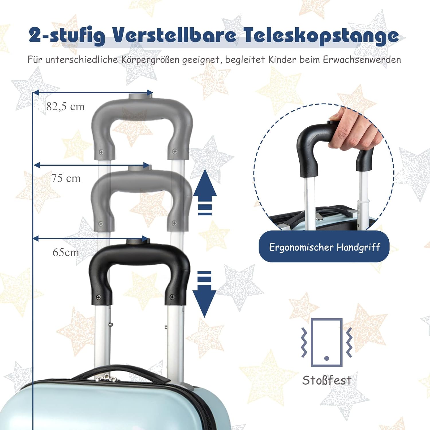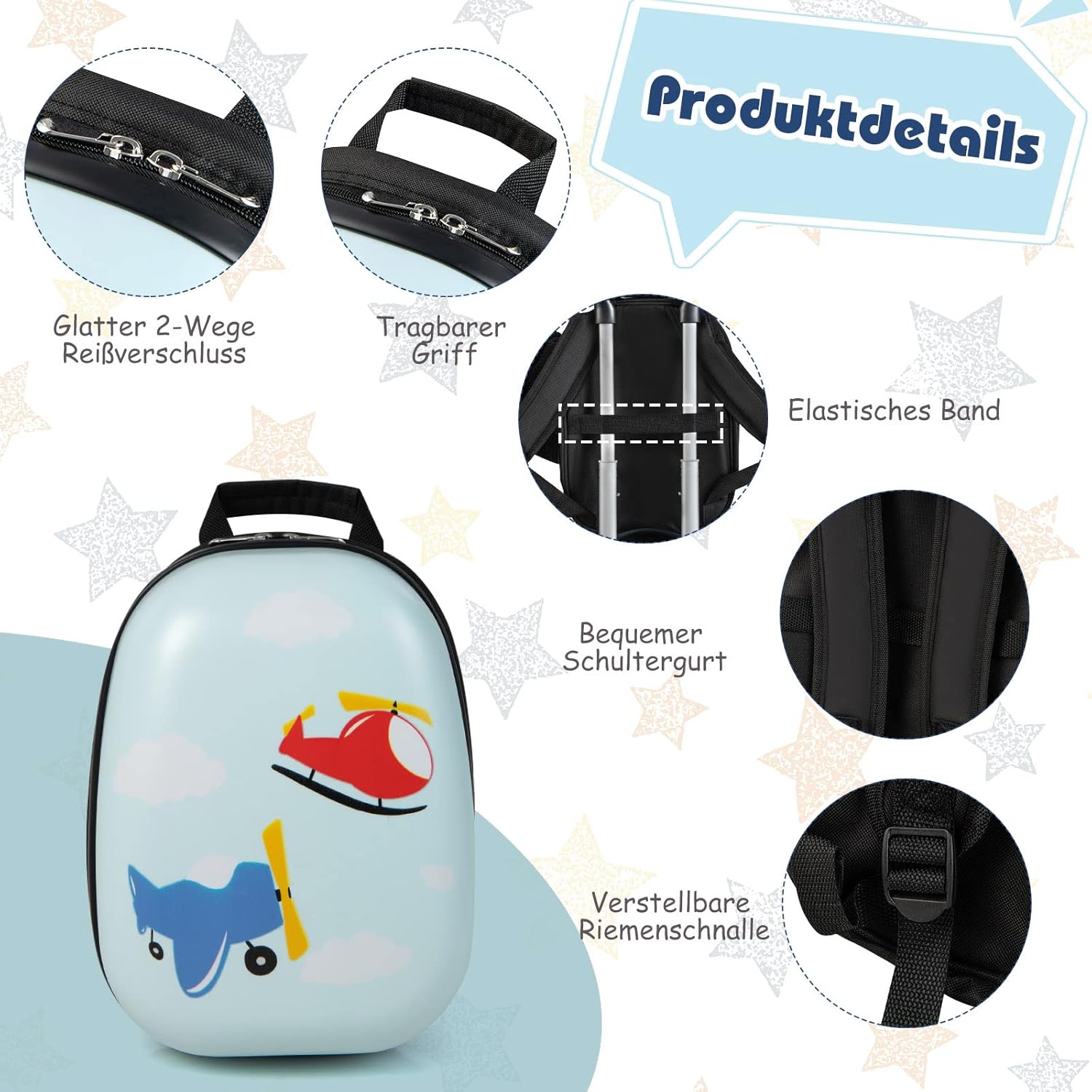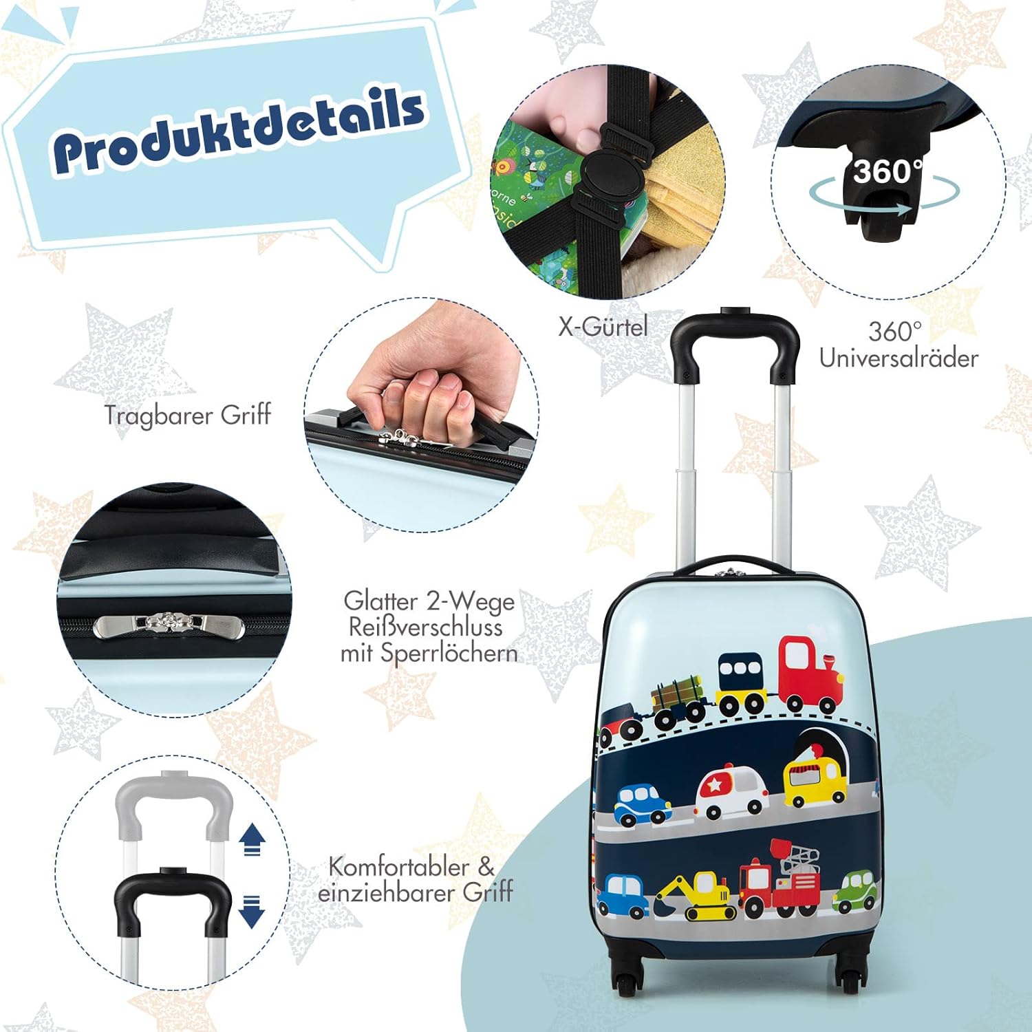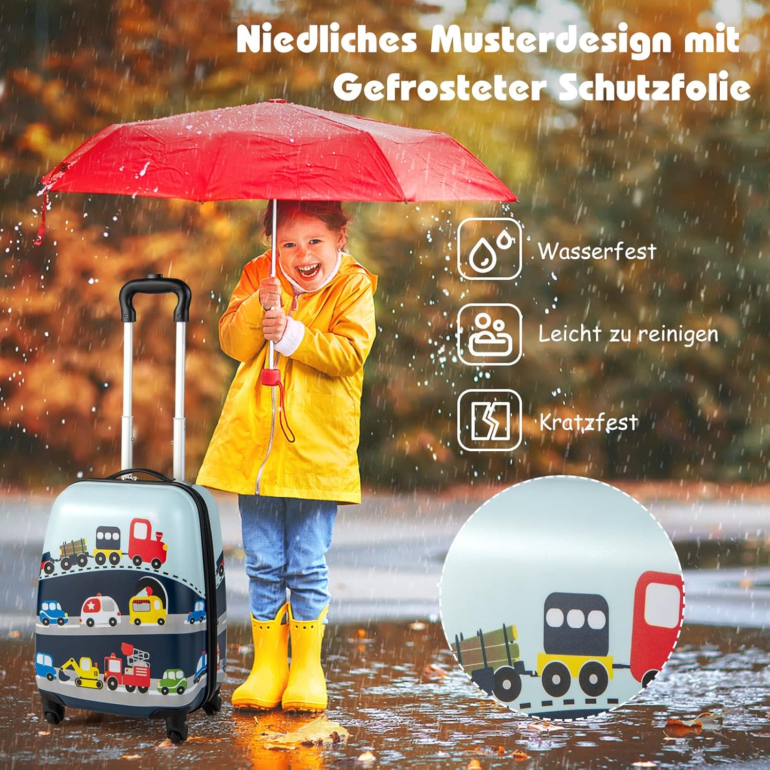 Kinderfreundliches Aussehen – Die Zeichnungen auf dem Koffer und Rucksack sind kinderfreundlich und attraktiv für die Kinder. Deswegen gilt dieses Kinderkofferset auch als ein sehr gutes Geschenk für Ihre Kinder.