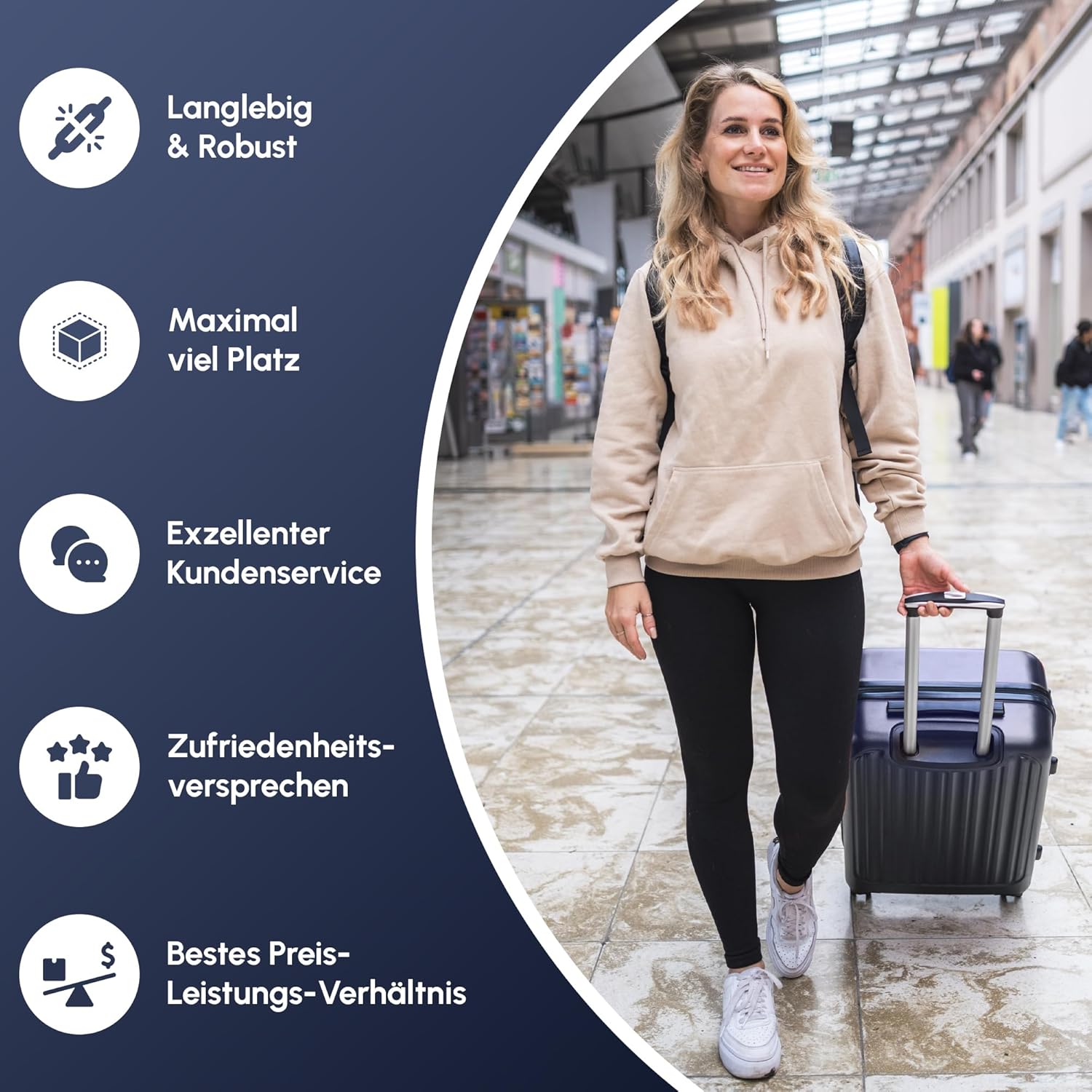 Die Kunden sind mit der Qualität, Größe, Farbe und Beweglichkeit des Koffers zufrieden. Er wird als stabil, gut verarbeitet und leicht beschrieben. Die Rollen rollen einwandfrei und ermöglichen eine einfache Handhabung. Viele finden ihn überraschend leicht, was das Packen erleichtert. Die Optik und der ausziehbare Griff werden ebenfalls gelobt.