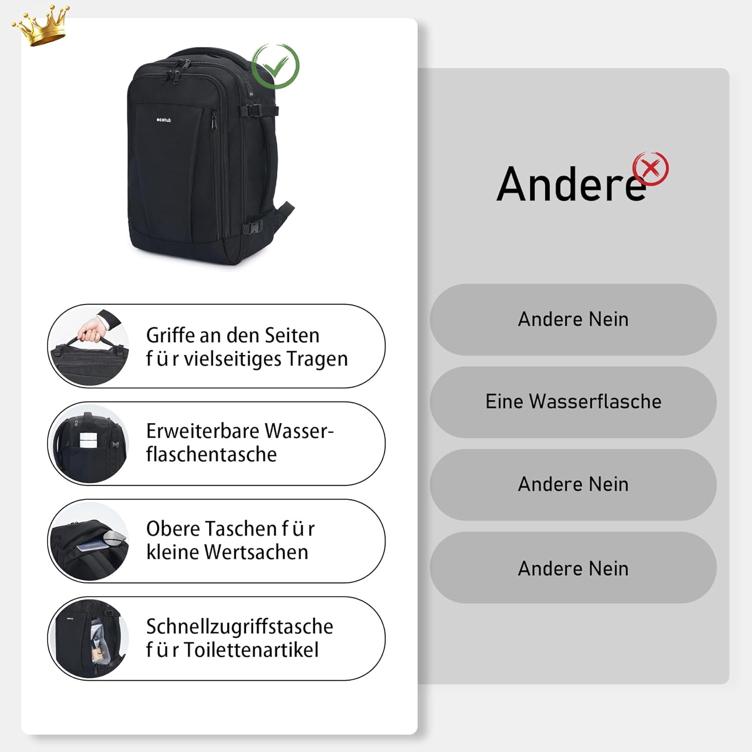 【Garantiert】: ECOHUB rucksäcke reisetaschen verwenden strapazierfähige SBS Reißverschlüsse und verstärkte Ripstop-Nähte für dauerhaften Gebrauch. Unser Engagement für qualitativ hochwertige Reisetaschen ist unerschütterlich. Wir schätzen Ihre Meinung sehr und streben nach einer hervorragenden Kundenerfahrung. Bei Fragen stehen wir Ihnen gerne zur Verfügung.(Patent anhängig)