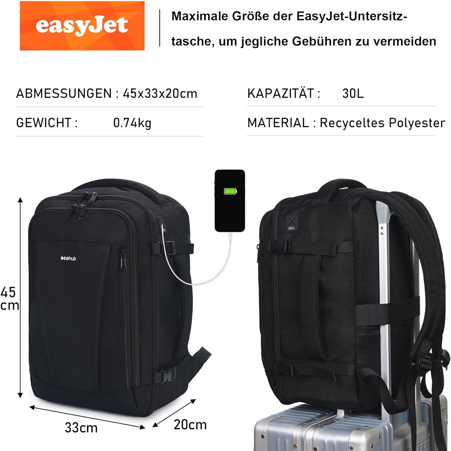 【Geboren für Easyjet, Sparen Sie Ihre Gebühren】: ECOHUB-handgepäck rucksack mit den Abmessungen 45x36x20 cm und einem Fassungsvermögen von 30 Litern ist speziell für Easyjet konzipiert (der maximale genehmigte Reisekabinenrucksack KOSTENLOS) und wird auch als zweite Tasche mit Priority Boarding akzeptiert.
