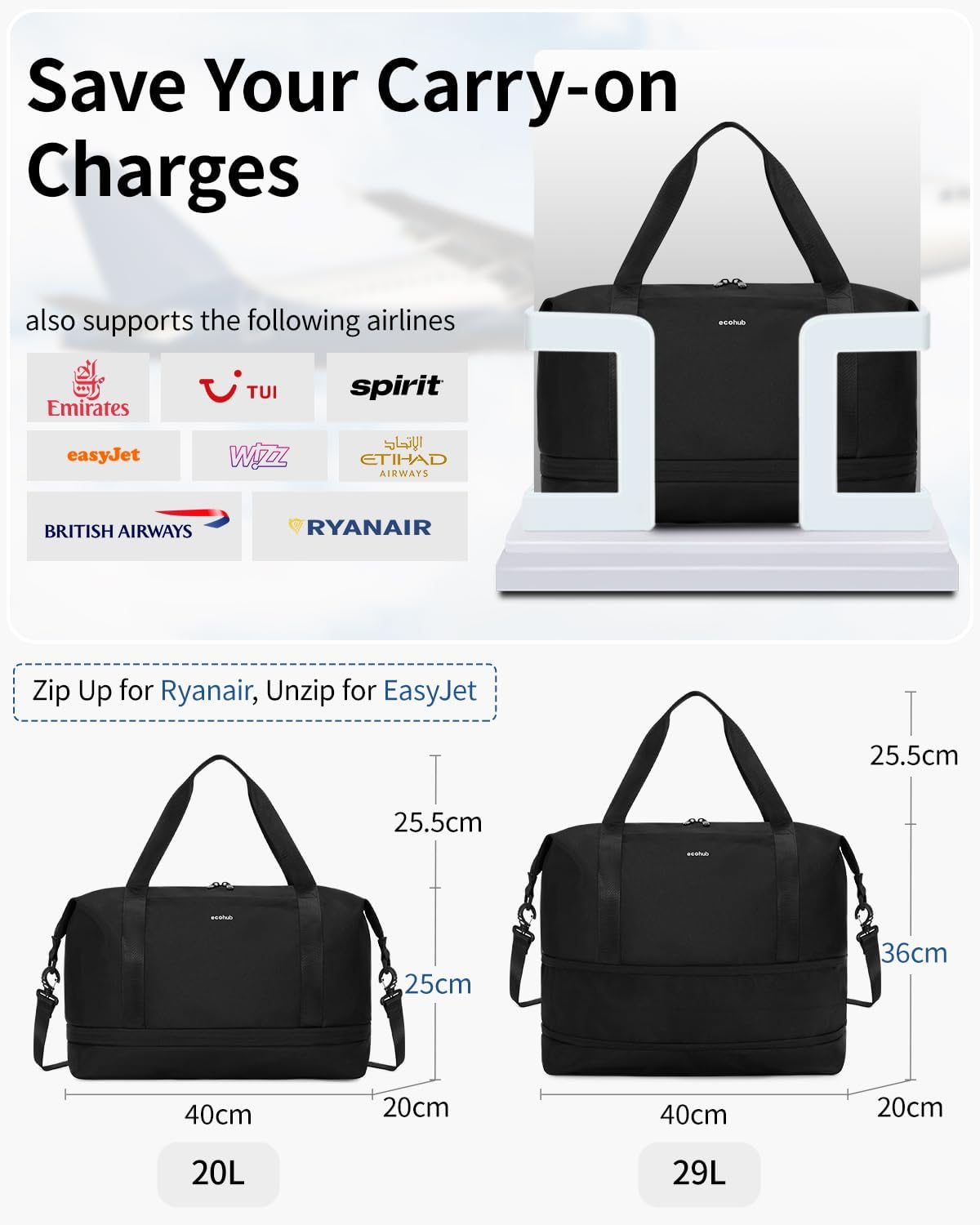 ECOHUB Erweiterbares Ryanair Easyjet Handgepäck Weekender, mit abnehmbar Nass-Tasche (Schwarz)