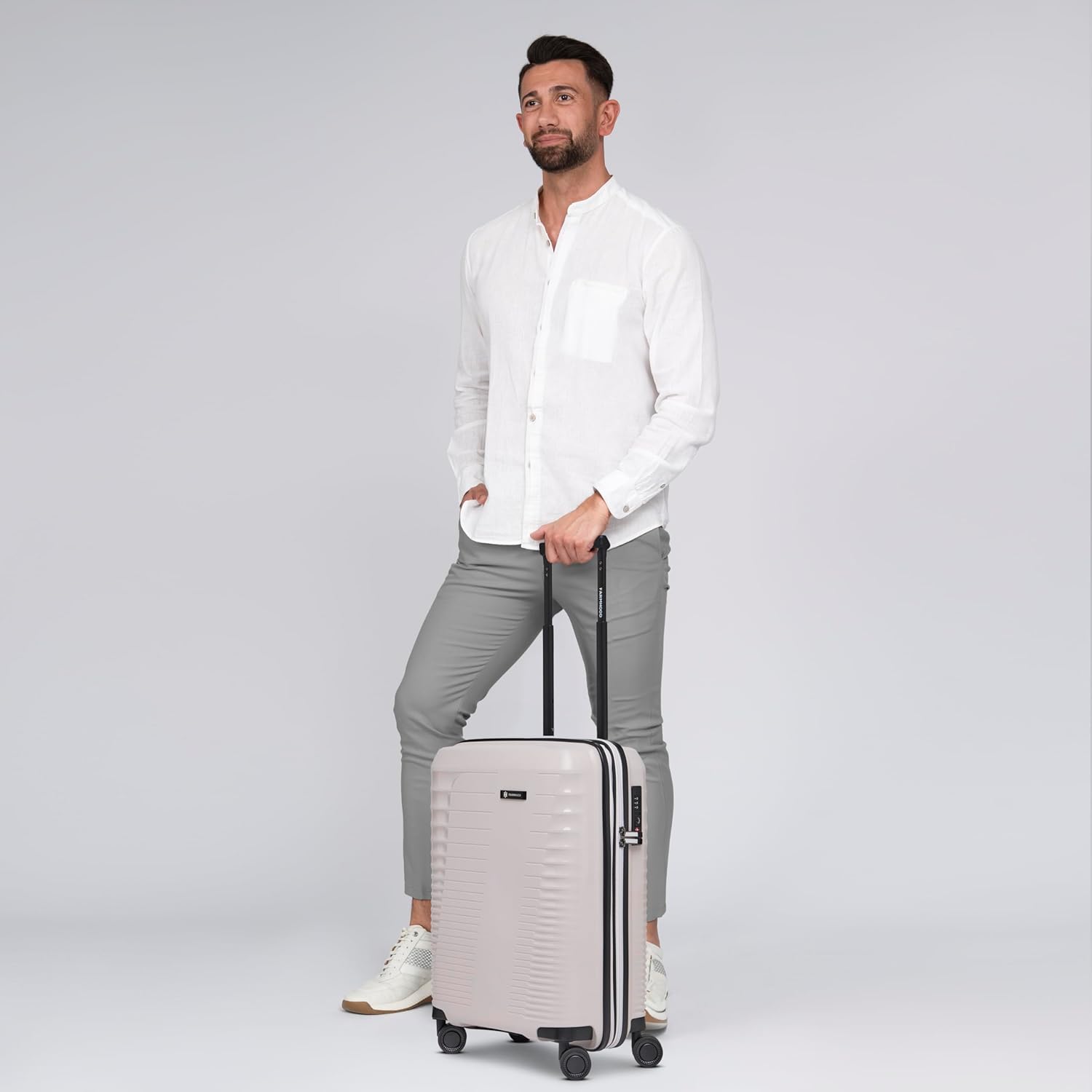 Das Boardgepäck Koffer von Farmhood ist mit Maßen von 40x22x55 (LxBxH) und einem Gewicht von leichten 2,61 optimal auf die Handgepäck-Bestimmungen vieler Fluggesellschaften abgestimmt. Durch eine praktische Dehnfalte kann der Polypropylen Trolley um 6 cm in die Breite erweitert werden, was das Volumen auf ca. 44 Liter erhöht. Dies bietet ausreichend Stauraum für Citytrips oder Geschäftsreisen bis zu 5 Tage und bis zu 8-10 kg Gepäck. Die stabile Hartschale aus Polypropylen und hochwertiger Strohfaser schützt Ihr Gepäck optimal und ist zudem umweltfreundlich, da sie zu 25% aus Stroh besteht – einem Abbauprodukt aus Weizen und Reis. Dies macht den Koffer schneller abbaubar und teilweise recycelbar, während der Energieverbrauch bei der Produktion reduziert wird. Das Biokunststoffmaterial enthält keine gesundheitsbedenklichen Weichmacher. Für Sicherheit sorgt das TSA-Schloss, das den Richtlinien entspricht und eine problemlose Inspektion ohne Beschädigung ermöglicht. Die hochwertigen Gummi-Doppelrollen ermöglichen ein müheloses und leises Gleiten in alle Richtungen, während der ausziehbare Teleskopgriff zusätzlichen Komfort bietet. Der Koffer ist perfekt organisiert mit einer Reißverschluss-Trennwand, einer aufgesetzten Tasche sowie einem Kreuzpackgurt. Diese bieten viel Platz für Kleidung, Schuhe und Toilettenartikel. Farmhood designt seine Produkte in Deutschland mit Fokus auf Qualität, Langlebigkeit und Funktionalität – egal ob für Kreuzfahrten, Familienurlaube, Geschäftsreisen oder Wochenendtrips.