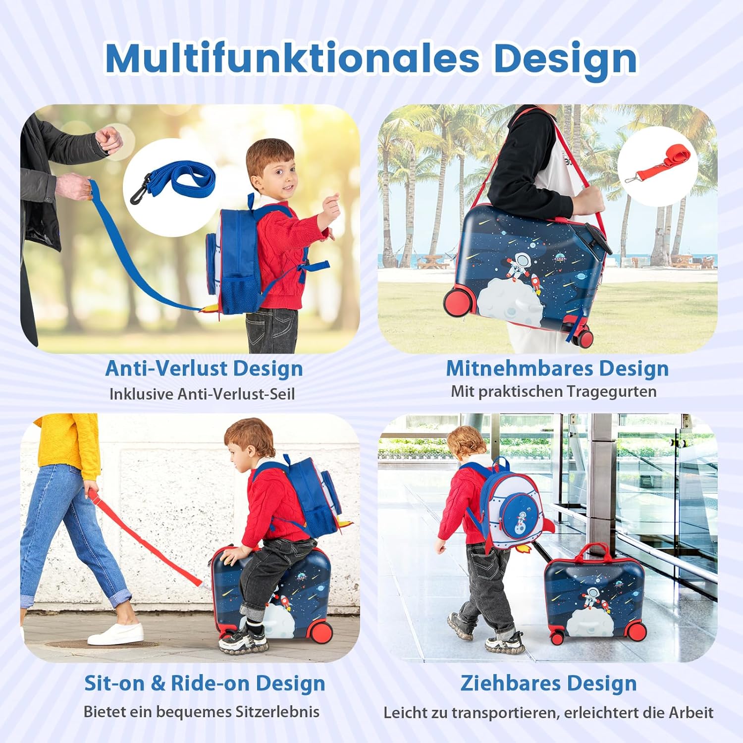 Durchdachtes Design: Das Kindergepäck sieht nicht nur gut aus, sondern ist dank der vier Räder flexiblen Räder, die sich um 360° drehen lassen, bequem und praktisch zu benutzen. Darüber hinaus ist die Höhe des Griffs des verstellbar und genau auf Anforderung von Kindern unterschiedlichen Alters anzupassen.