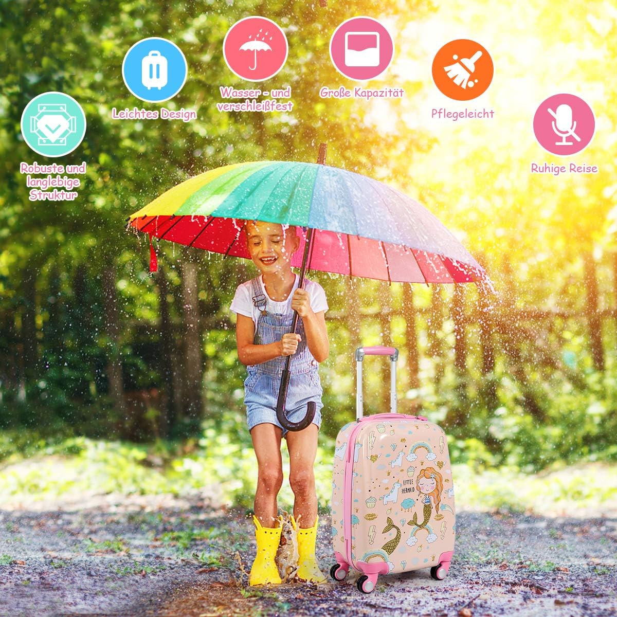 Durchdachtes Design: Das Kindergepäck sieht nicht nur gut aus, sondern ist dank der vier Räder flexiblen Räder, die sich um 360° drehen lassen, bequem und praktisch zu benutzen. Darüber hinaus ist die Höhe des Griffs des verstellbar und genau auf Anforderung von Kindern unterschiedlichen Alters anzupassen.