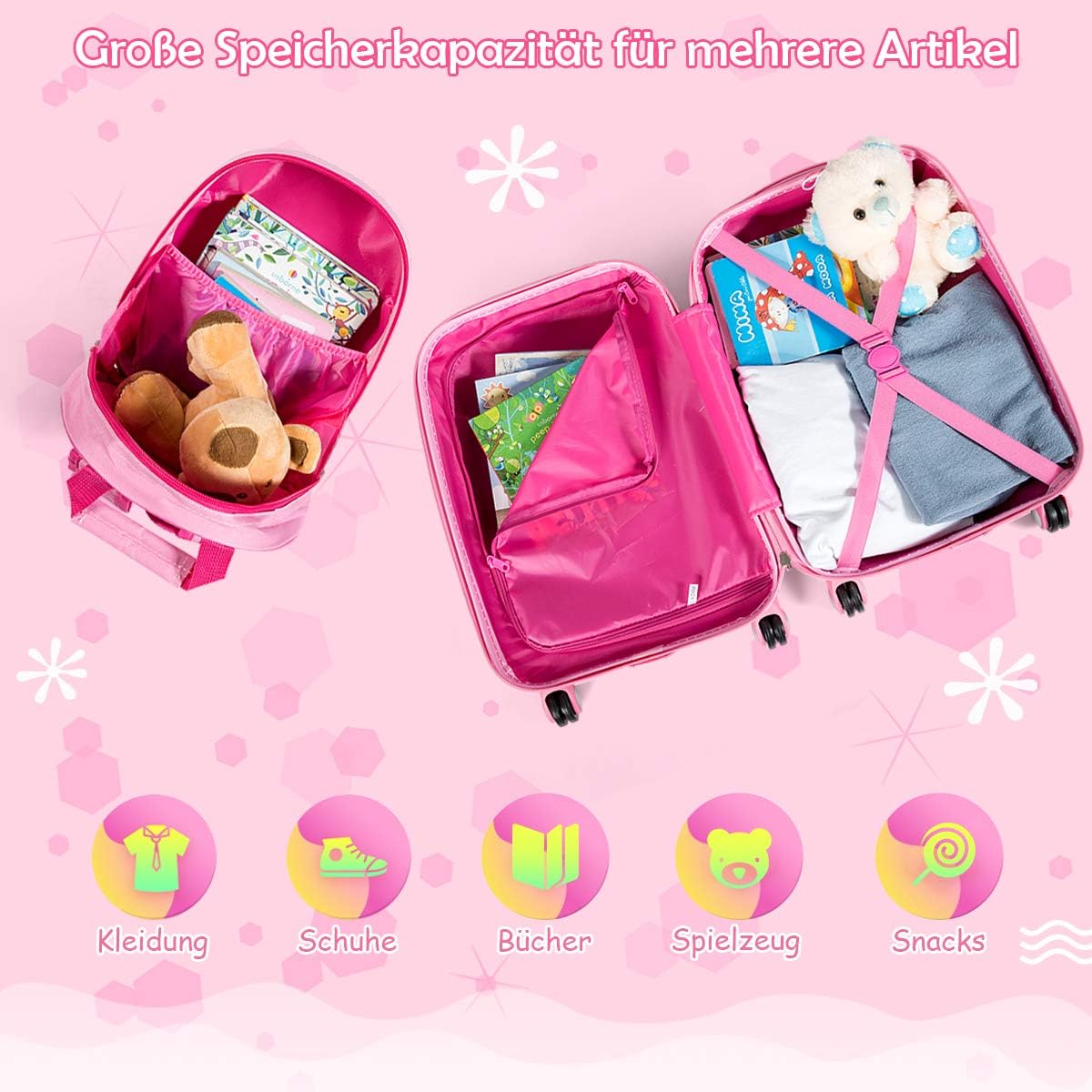 Kombination aus Rucksack und Trolley: Der Kinderkoffer Set bieten viel Stauraum für Ihr Kind. Der Kindertrolley hat zwei Fächer, eines mit Packgurten und das andere mit einem Reißverschluss. Kinder können die Gegenstände sortieren und nach Wunsch ordnen.