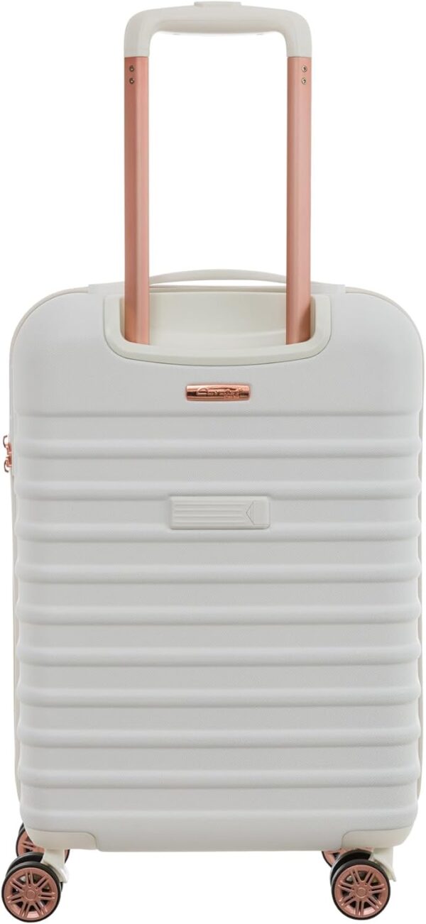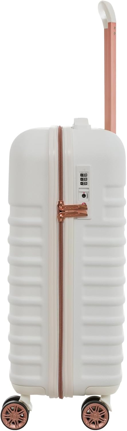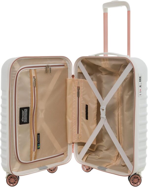 Weiße Robuste und kleine Kabinen Bordgepäck, Marken Koffer Hartschalen Reisekoffer Trolley auf Räder 54 cm von Cavalet bei BOWATEX zu Kaufen. Außenmaße Inkl. Rollen und Griff ca. 55 x 37 x 21 cm. Gewicht ca. 2,7 kg Leicht. Innenmaße Schalle ca. 47 x 35 x 20 cm. Pack Volumen ca. 30 – 35 Liter. Material. ABS – Polycarbonat mix – Hartschalentrolley. TSA-Zahlenschloss mit Reißverschluss verschließbar. 4 leise Leichtlauf Doppelrollen Rotation 360°. Aluminium Teleskop Ausziehgriff, 1 Tragegriff und auf der Rückseite ist ein Adressenschild angebracht. Innen Spanngurte und Reißverschlusstrennwand mit Netzhemdfach und Kosmetik Täschchen.