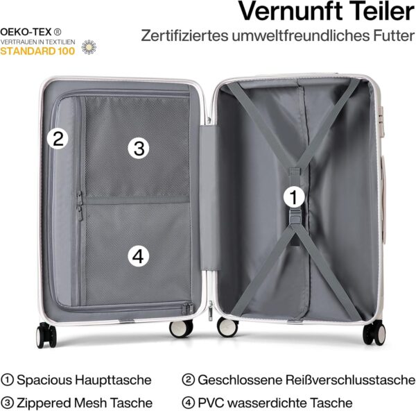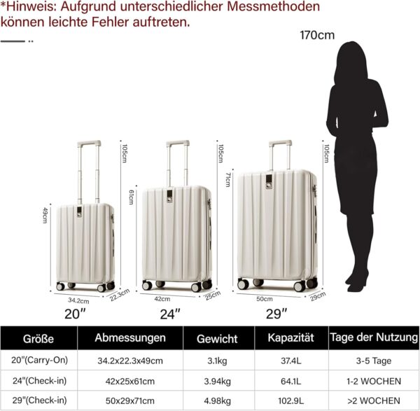 【Erweiterbarer Koffer】S: 49×34,2×24 cm (40L) → erweitert auf 49×34,2×28 cm (47L). M: 61×42×28 cm (72L) → erweitert auf 61×42×32 cm (82L). XL: 71×50×31,5 cm (112L) → erweitert auf 71×50×35,5 cm (126L). Bis zu +15% Stauraum bei Bedarf. Ideal für Mehrbedarf auf Geschäftsreisen oder Familienurlauben. Platzsparende Grundgröße mit flexibler Erweiterungsoption