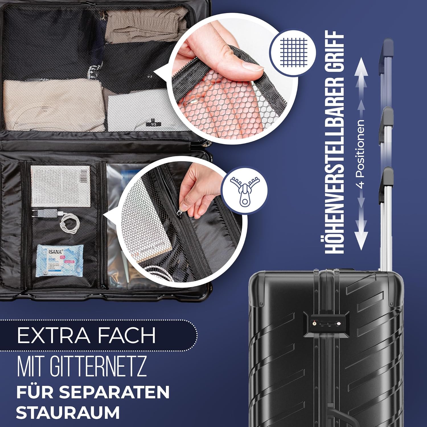 Ich habe einen leichten Koffer gesucht, der Fächer hat und der beim öffnen nicht ein Chaos entstehen lässt.Dieser ist perfekt für meine Bedürfnisse. Die beiden großen Fächer sind mit Reißverschluss zu schließen. In anderen Koffern ist es nur ein Gummiband. Total durchdacht ist das Nassfach. Ob nun Cremes, Shampoo oder der nasse Badeanzug. Keine bösen Überraschungen das was ausläuft und die Kleidung ruiniert.Er ist leicht und total wendig. Der Teleskopgriff wirkt sehr stabil. Und ich finde auch die Räder gut. Sie verkanten nicht.Wenn ich was negatives suche, dann das es ihn nur in Silber und Schwarz gibt. Eine knallige Farbe wäre cool.Ich würde ihn wieder kaufen.