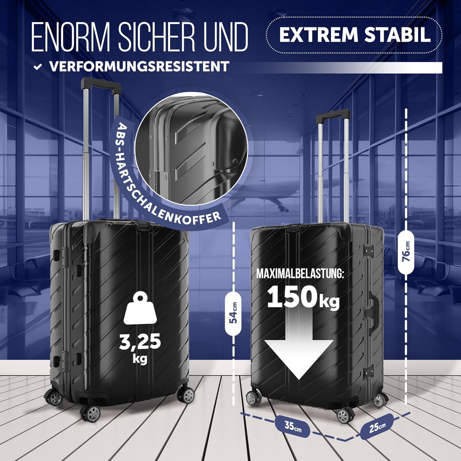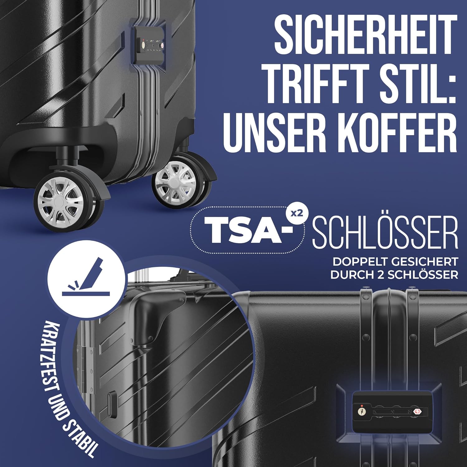 Der Hartschalenkoffer verfügt über einen Eckenschutz mit Verstärkung an jeder Ecke. So übersteht er auch Stürze, härtere Transporte und unebene Wege problemlos! Die hochwertige Verarbeitung sichert den dauerhaften Gebrauch über alle Reisen hinweg.