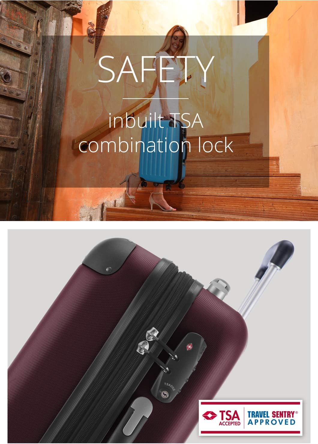 Mehr Sicherheit auf unbekannten Wegen: Das TSA-Zahlenschloss ist ausgesprochen wichtig für Reisen in die USA: Da es mit einem speziellen Schlüssel vom Flughafen-Sicherheitspersonal geöffnet und verschlossen werden kann, werden Beschädigungen des Reise-Trolleys durch gewaltsames Öffnen verhindert. Selbstverständlich können die Zipper des Reißverschlusses abgeschlossen werden und schützen den Kofferinhalt vor Zugriffen durch Unbefugte.