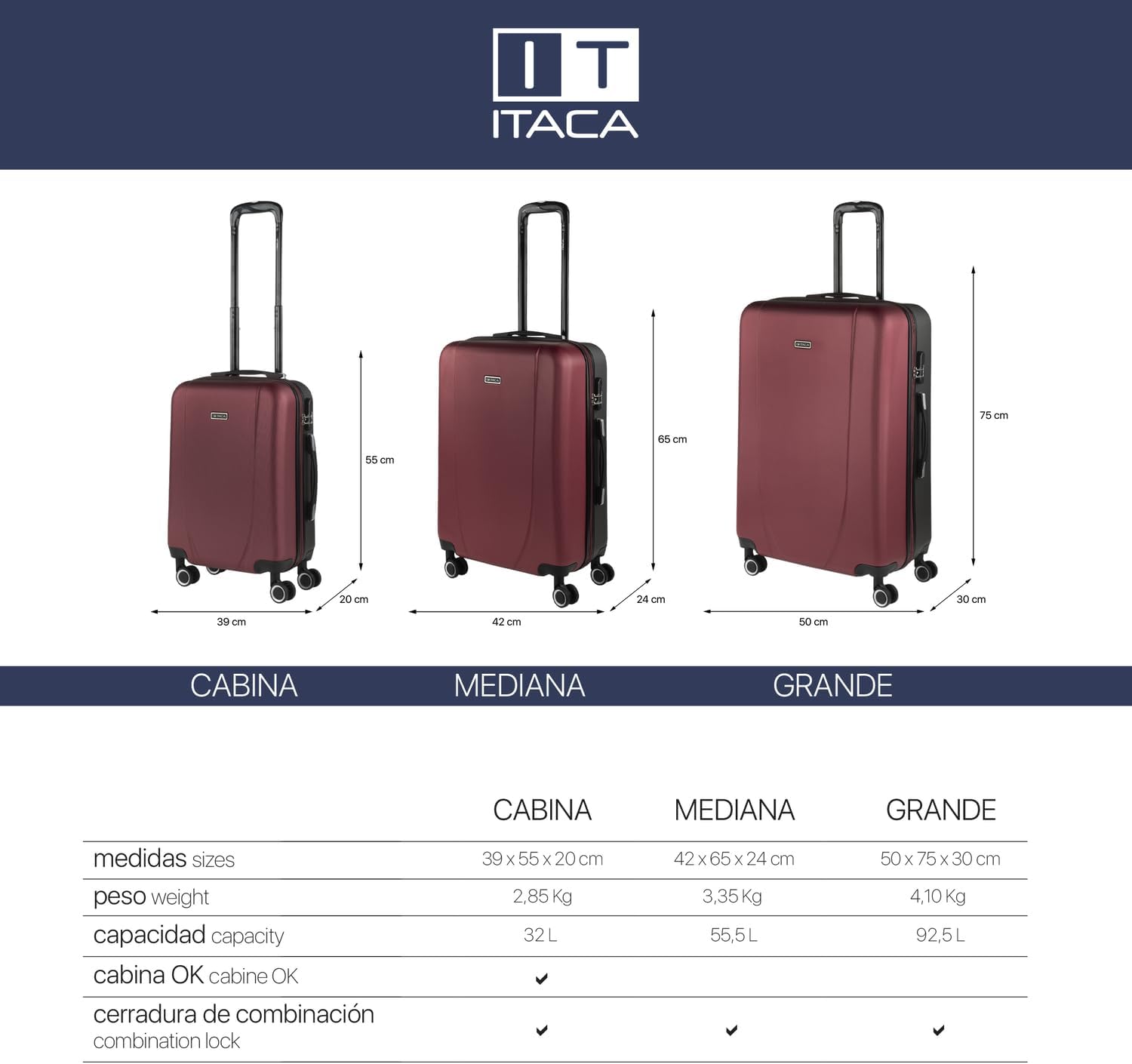 Gesamtabmessungen: 55x39x20 cm Kofferstruktur: 47x38x20 cm Gewicht: 2.85 kg. Rau ABS.