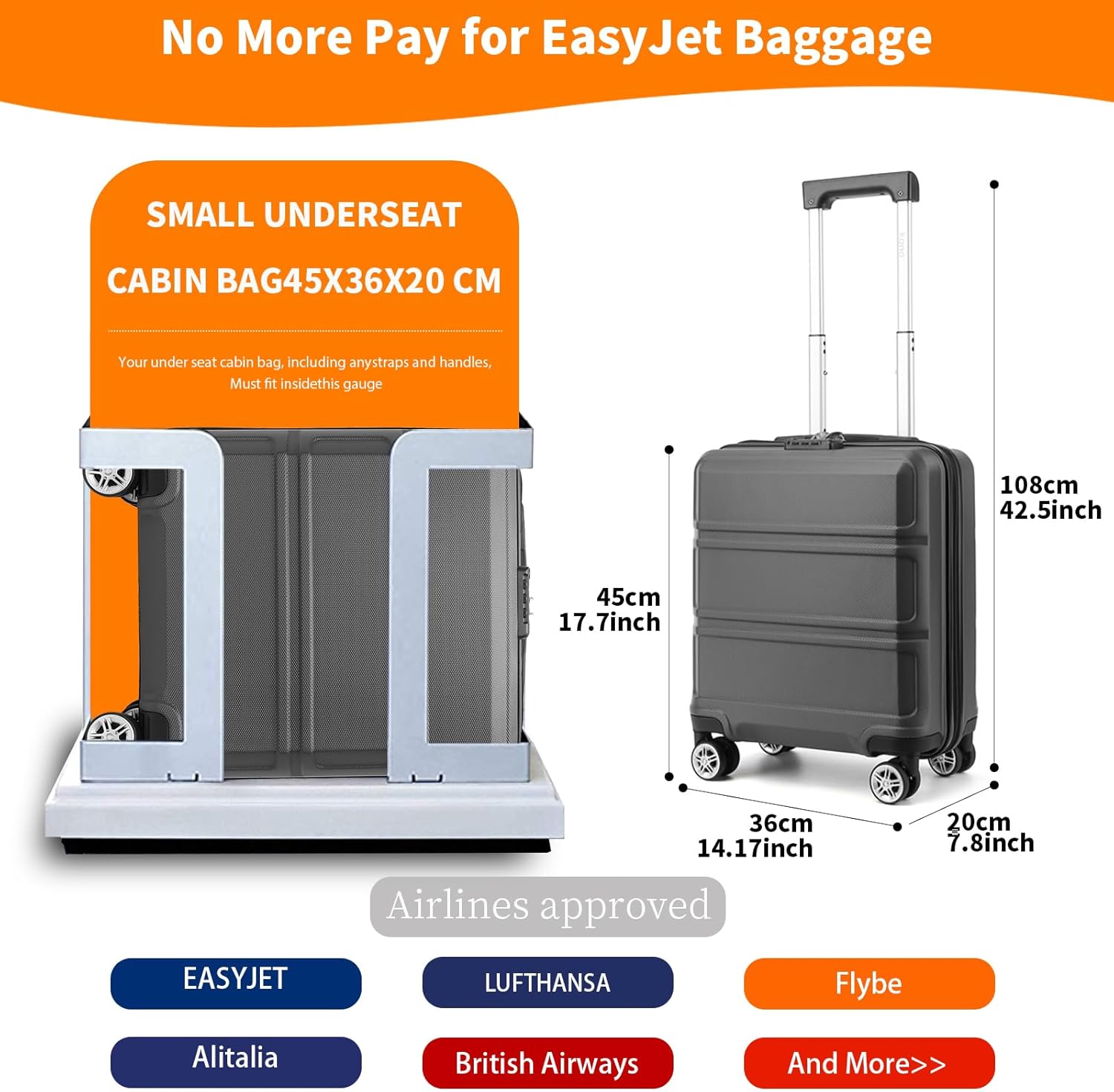 KONO Kleiner Handgepäckkoffer Hartschale für Easyjet 45x36x20 cm, mit 4 Rollen & TSA Schloss
