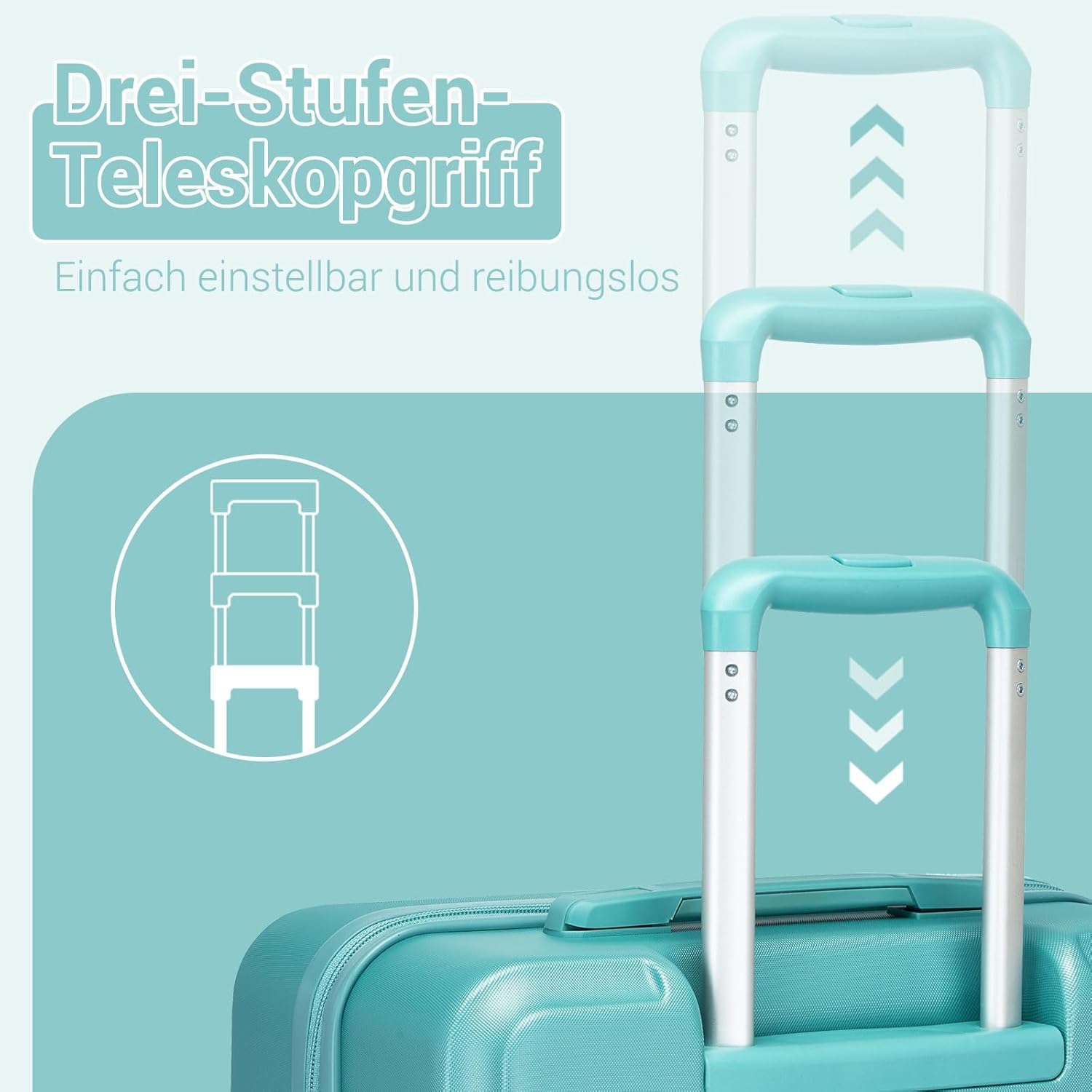 Anpassbarer Teleskopgriff: Der 3-stufig verstellbare Aluminium-Teleskopgriff des Kono-Trolleys passt sich jeder Körpergröße an und garantiert komfortables Handling auf Reisen.