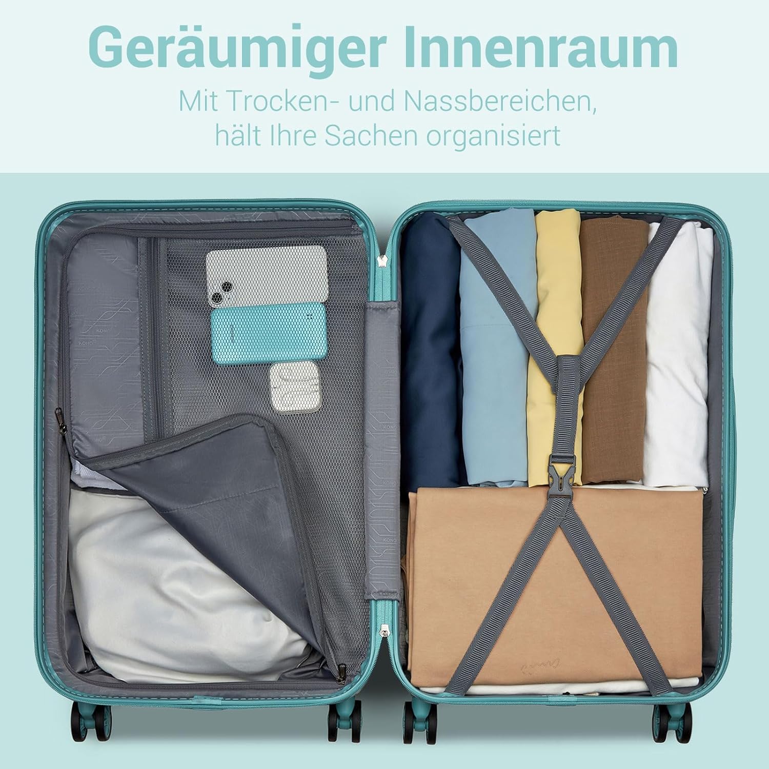 Leichtgewicht & Langlebig: Der Kono reisekoffer mittelgroß besteht aus hochwertigem PC+ABS-Material – extrem leicht, stoßfest und widerstandsfähig für optimalen Schutz Ihrer Reiseutensilien.
