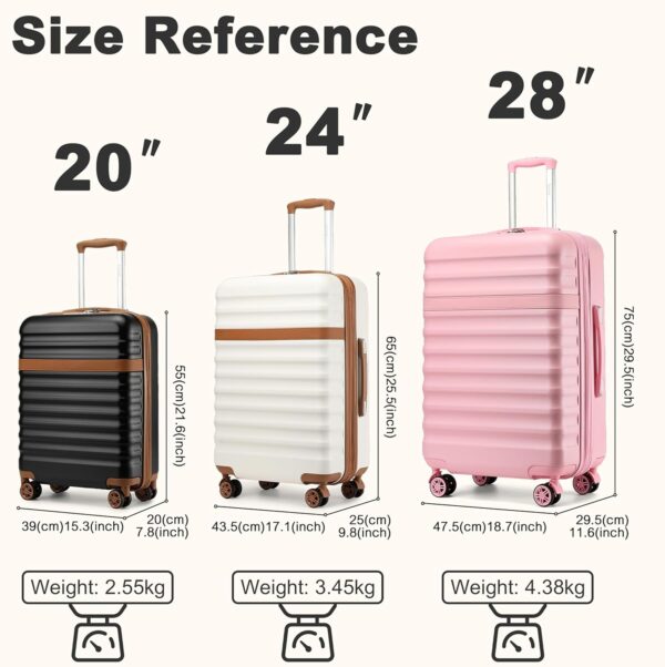 Material Hochwertigem ABS+PC-Material, Leicht und robust, schön und kratzfest Spinnerräder 360° doppelreihige Schwenkräder aus TPE-Silentmaterial Teleskopstange 3-stufig arretierbare Teleskopstange Zahlenschloß Sichere und zuverlässige versenkte TSA-Zollschlösser Erweiterbar 24″ L/ 28″ XL, Erweitert um 15 % für mehr Platz Griffe 24“ L/ 28“ XL mit zusätzlichen seitlichen Softgriffe
