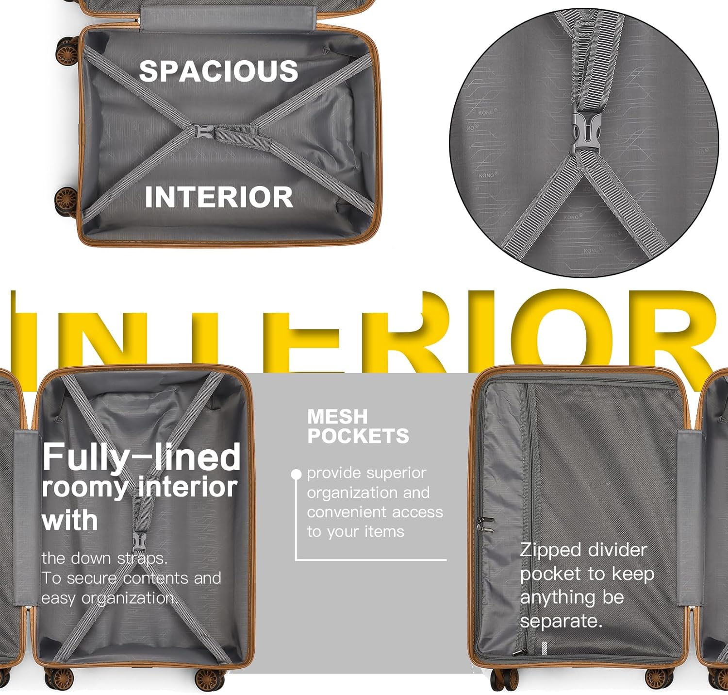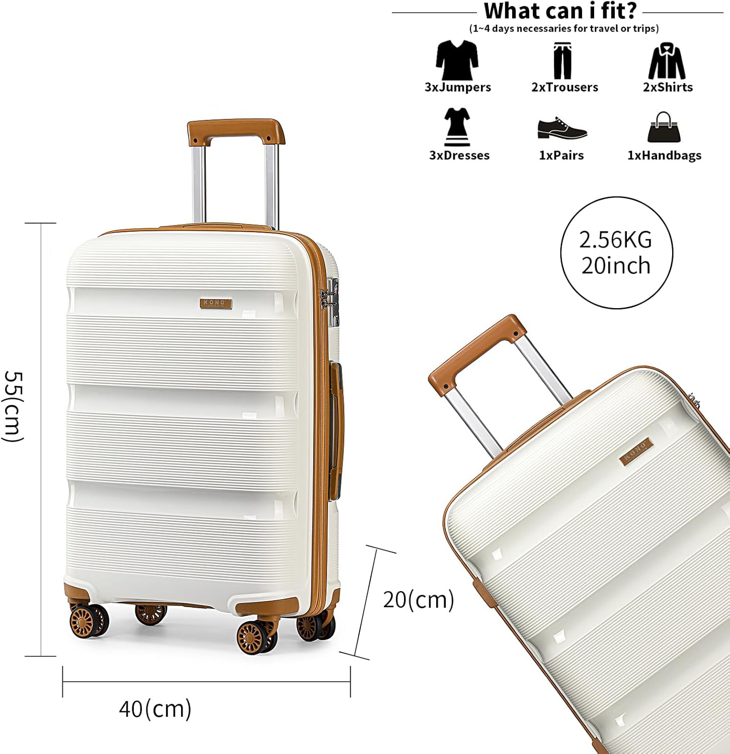 KONO Reisekoffer Handgepäck Koffer Gepäck-Sets 3 Teilig Kofferset, 55cm Klein Hartschalenkoffer mit Leicht Reisetasche und Kulturbeutel (Weiß/Braun)