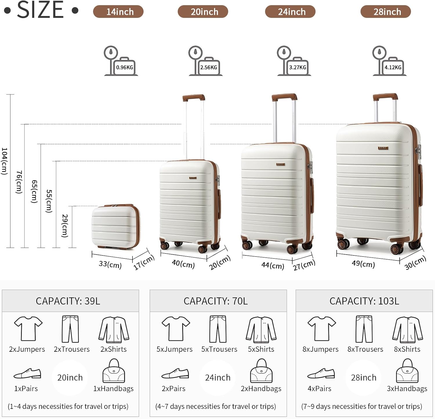 Der Koffer ist ideal für kurze Reisen.Die innere Trennung von der rechten und linken Kofferhälfte ist ideal, um Schuhe und weiteres von der Kleidung zu trennen.Habe den Koffer schon oft benutzt und war immer zufrieden. Die Rollen sind perfekt für eine einwandfreie Fortbewegung.In der Farbe Weiss ist der Koffer selbstverständlich anfälliger für nicht entfernbare Gebrauchsspuren. Der Koffer kann schnell schwarze Gebrauchsspuren haben.