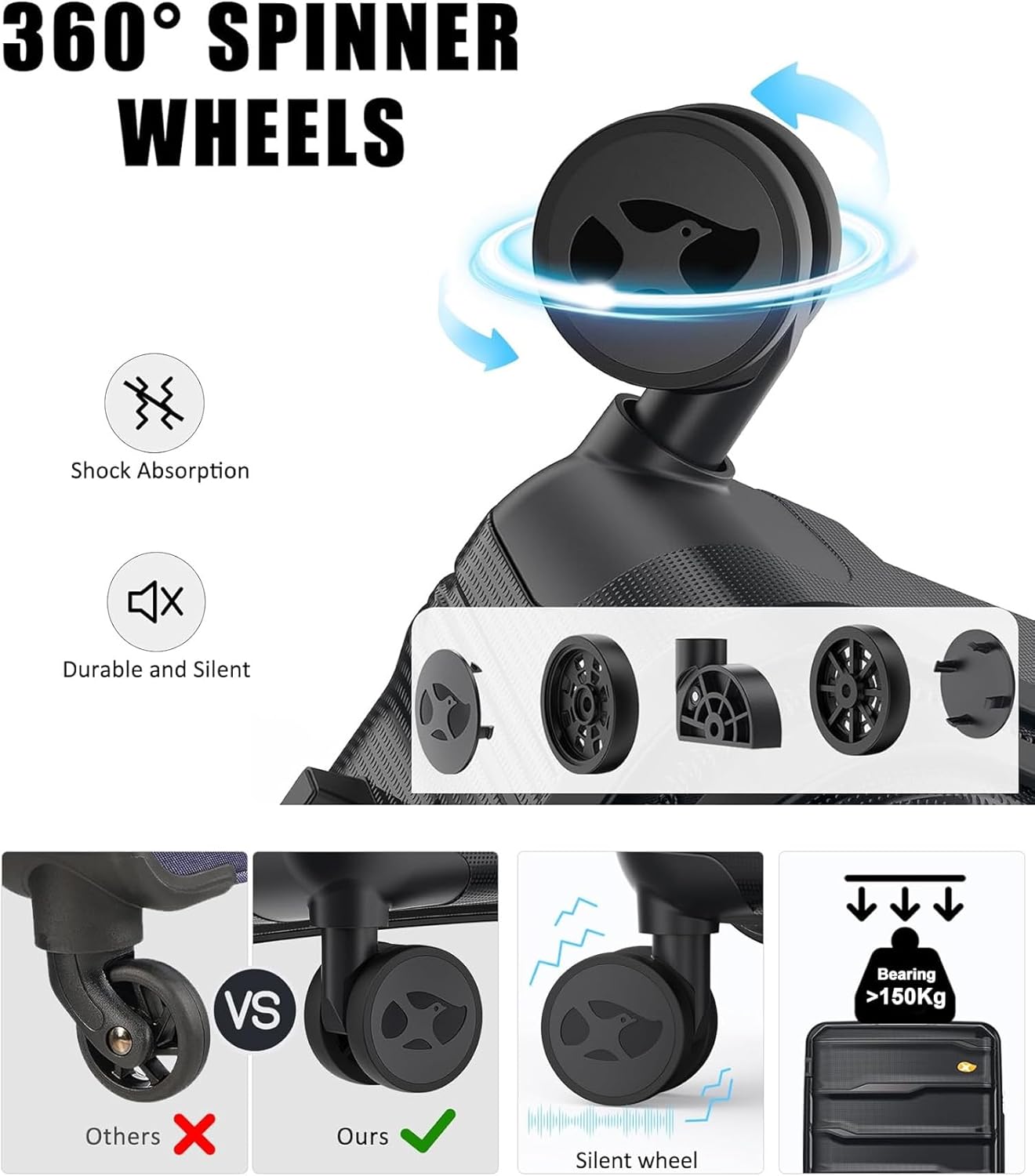 Ich habe die Koffer für den Urlaub gekauft( Prime Days), Sie kamen gut verpackt an und ihr äußerliches sieht bis jetzt top aus. Die Rollen haben keine Einschränkung. Ich habe sie noch nicht in der Praxis benutzt. Aber bis jetzt kann ich sie weiter empfehlen