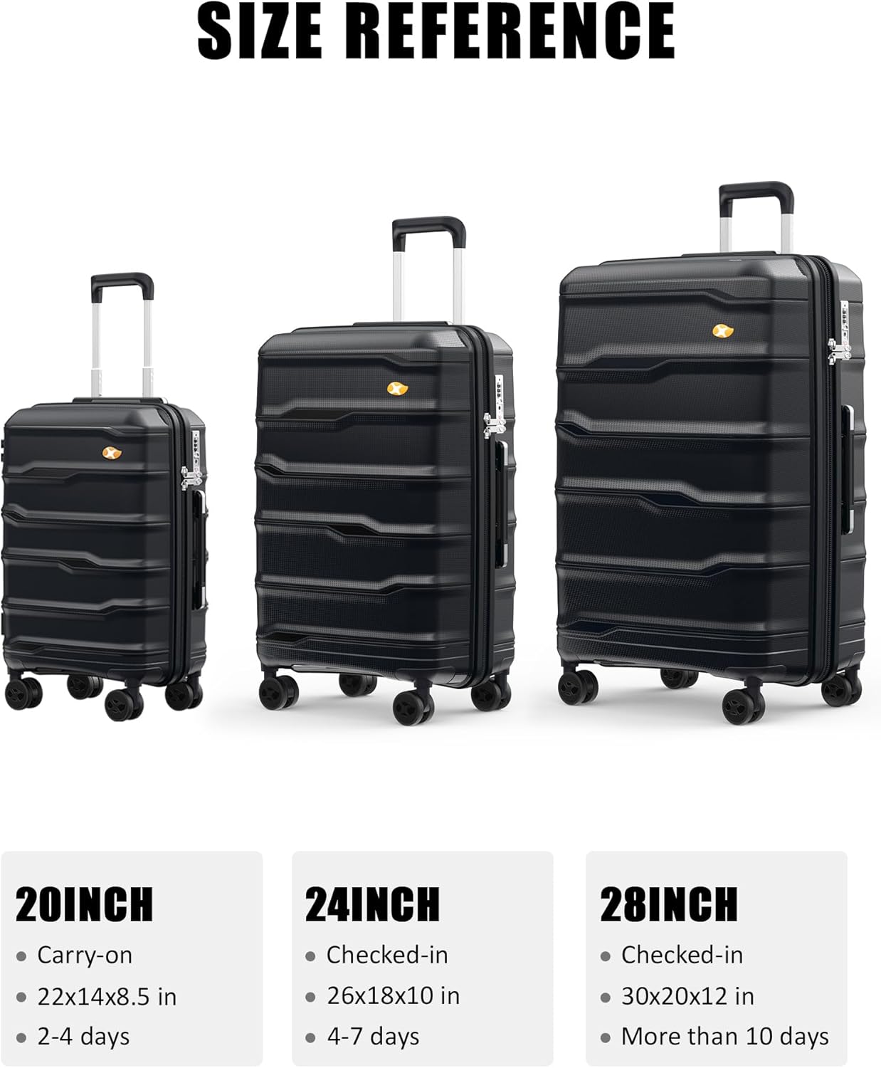 Articolo arrivato prima del previsto. La prima impressione è stata che la valigia potesse potesse contenere poca roba ma mi sbagliavo. L‘ ho usata per un viaggio di vacanza di 20 giorni e sono rimasto sorpreso di quanto sia stata la capienza; ho messo biancheria di ricambio per 20 gg . Robustezza e leggerezza i punti di forza,bene anche la manovrabilità con le 4 ruote rinforzate e la dotazione di un lucchetto a combinazione numerica.