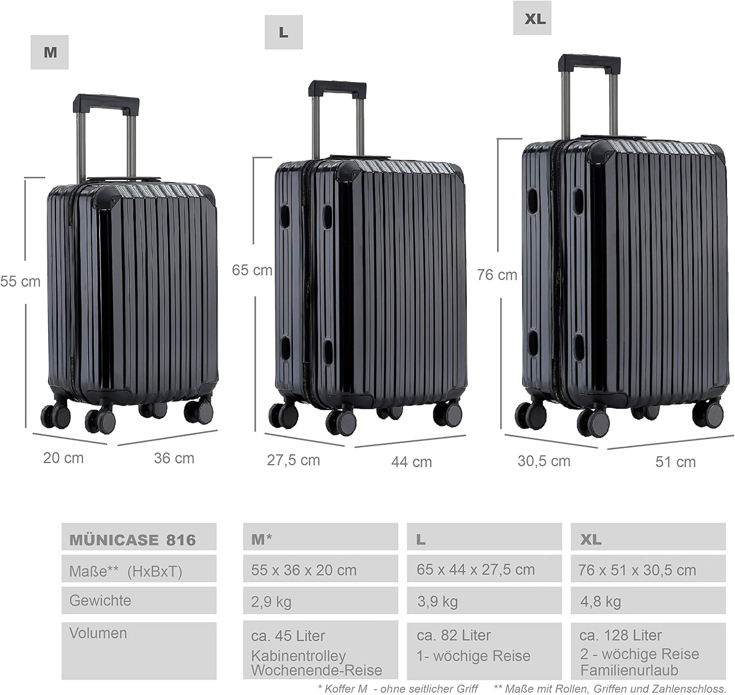 【3 tlg. Kofferset Maße mit Rollen und Griffen】: Handgepäck Kleiner Koffer (M-55 cm)-kein seitlicher Griff Maße mit Rollen und Griffen: 55 x 36 x 20 cm; Gewicht: 2,9 kg Volumen: ca.45 Liter; Mittelgroßer Koffer (L -65 cm) : 65 x 44 x 27,5 cm ;Gewicht: 3,9 kg Volumen: ca.82 Liter, Großer Koffer (XL-76 cm) : 76 x 51 x 30,5 cm , Gewicht: 4,8 kg Volumen:ca.128 Liter.