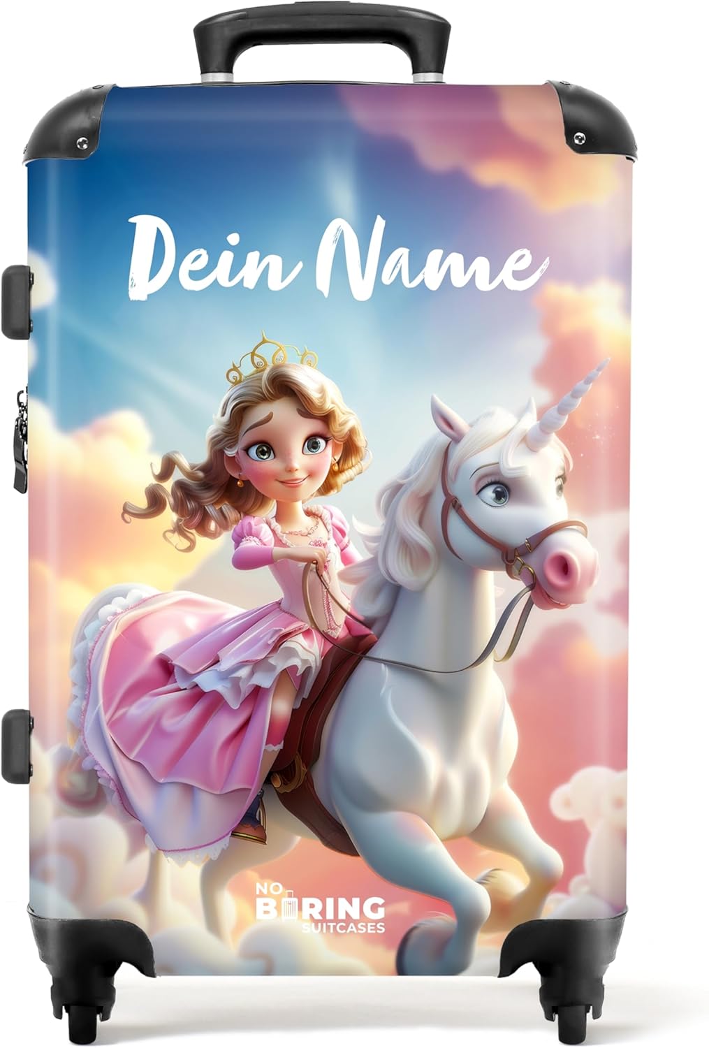 NoBoringSuitcases Kinderkoffer personalisiert, Mädchen, TSA, (Prinzessin, Einhorn – Rosa-Weiß)