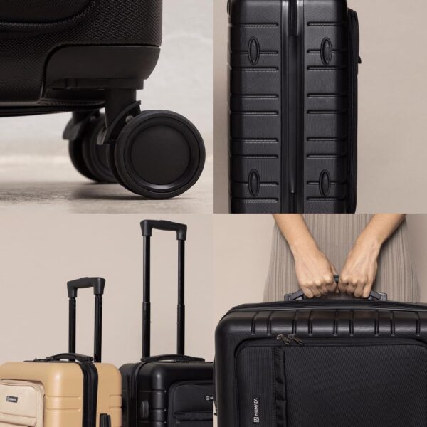 Buenos acabados. Bolsillo para bateria externa para móvil, con usb en el exterior, bonito detalle. Fluidez adecuada de ruedas. Neceser de botecitos de viaje de regalo en el interior, otro minipunto. Tamaño de cabina perfecto. Calidad precio 10. Recomendable.
