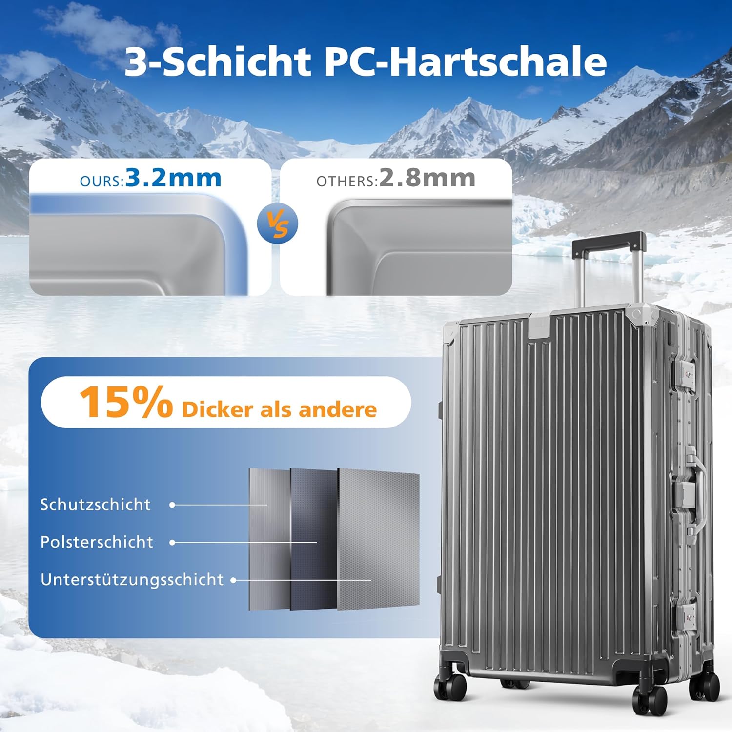 Der Koffer ist extrem geräumig und robust, ideal für Langstreckenreisen dank seiner stabilen Hartschale aus Polycarbonat und Alu.Dank der 4 leisen Rollen und dem praktischen TSA-Schloss lässt er sich sehr angenehm und sicher transportieren.