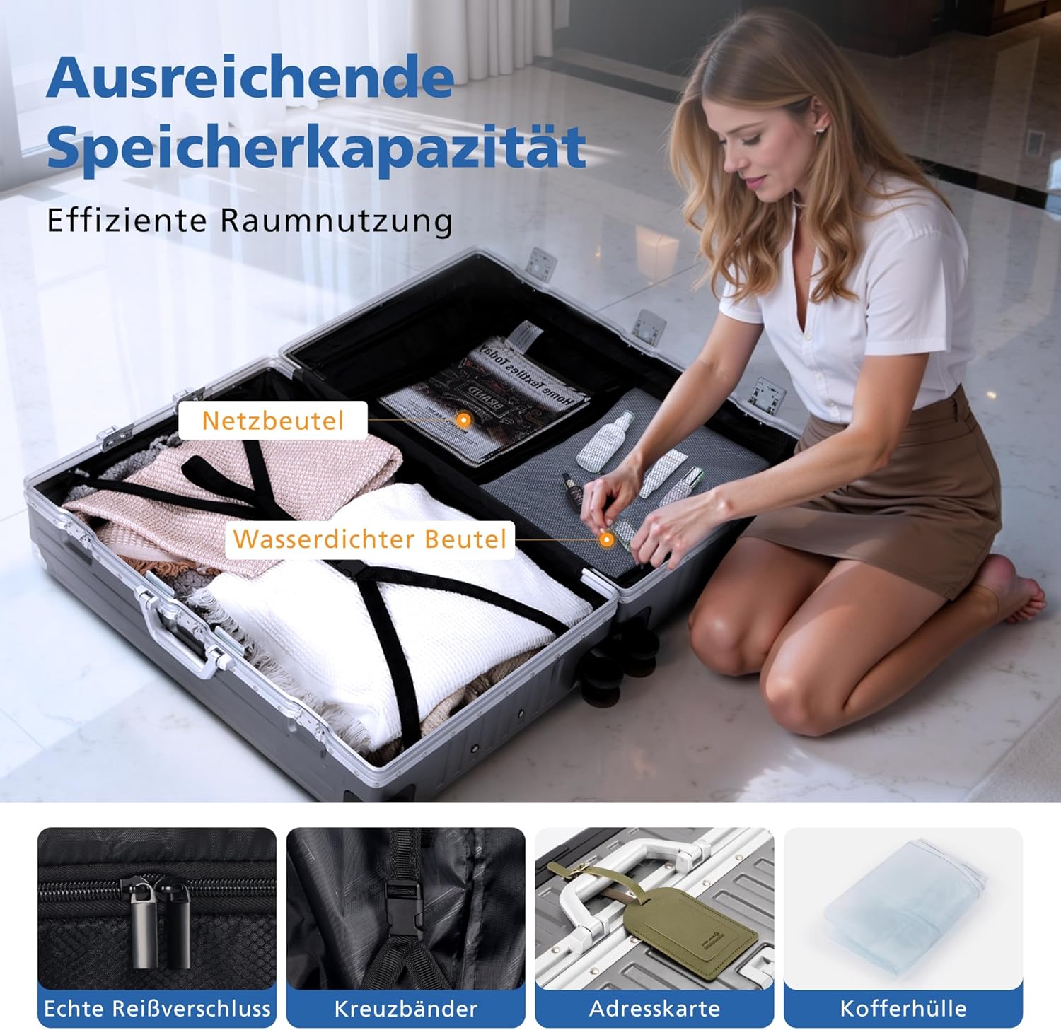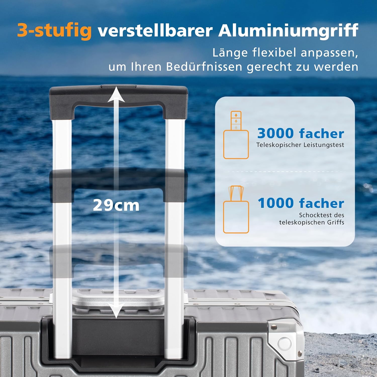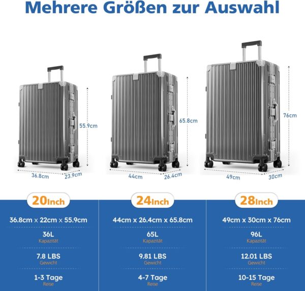 Vielseitige Reisegrößen: Der Alphasac aluminium koffer ist in drei praktischen Größen erhältlich. Die 20 Zoll Variante ist ideal für Kurztrips, während die 24 Zoll für eine einwöchige Reise bestens geeignet ist. Die 28 Zoll Version ist perfekt für längere Reisen. Die meisten Airlines erlauben diesen handgepäck trolley, sodass Ihre Reise entspannt und unkompliziert verläuft