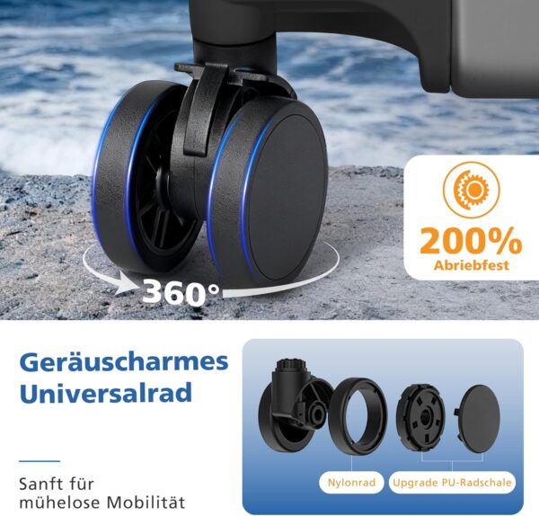 Der Koffer gefällt mir insgesamt sehr gut. Das Design ist schlicht und modern, und das Material macht einen robusten und hochwertigen Eindruck. Besonders überzeugt haben mich die leichtgängigen, leisen Rollen, mit denen sich der Koffer auch voll beladen problemlos schieben lässt. Verarbeitung und Funktion wirken durchdacht und passend zum Preis. Wie langlebig er nach vielen Flugreisen wirklich ist, wird sich zwar erst noch zeigen, der erste Eindruck ist aber definitiv positiv.Wäre noch besser gewesen, wenn der Koffer direkt nach Hause geliefert worden wäre und nicht zur Abholstation. Ist ja doch ein ziemlich großes Teil.