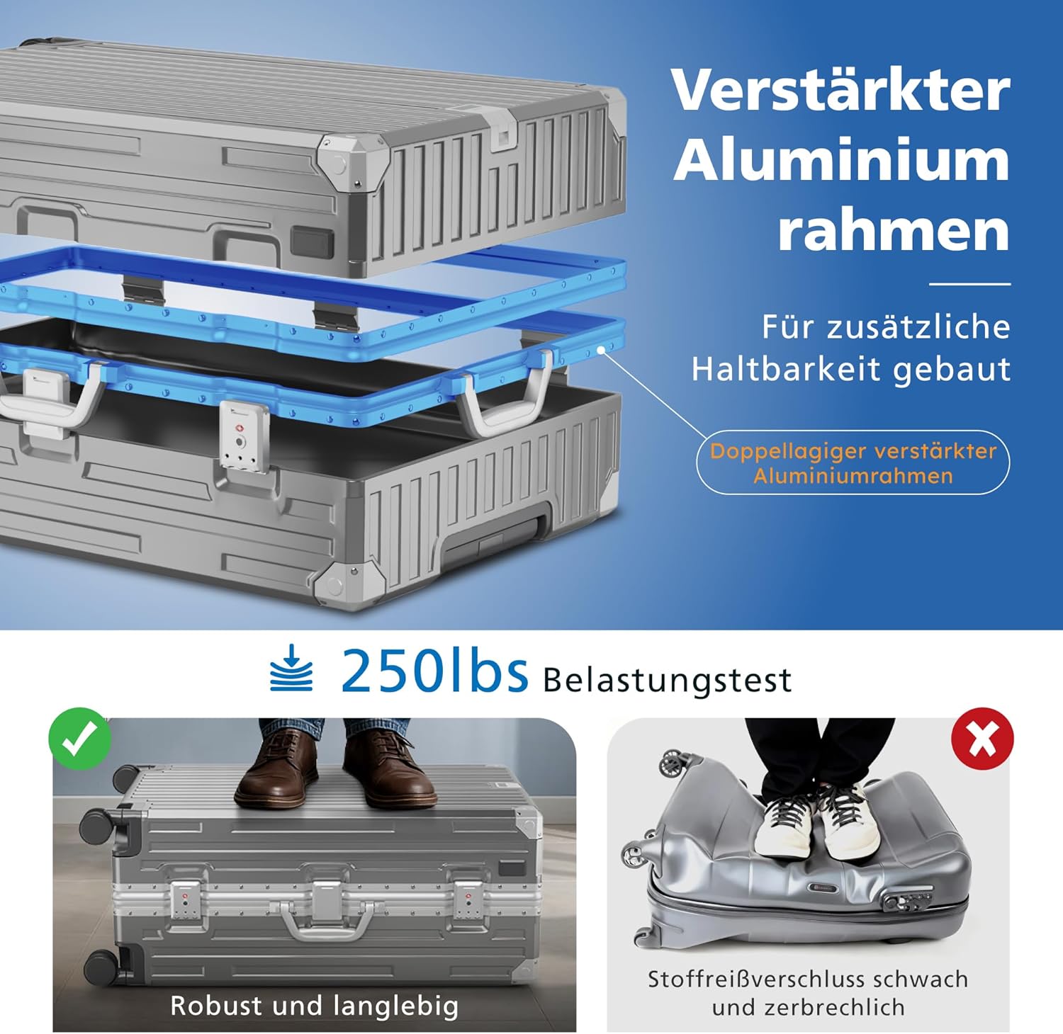 Hochwertige Aluminium- und PC-Konstruktion: Der Alphasac Koffer vereint ein robustes Aluminiumrahmen-Design mit einer stabilen PC-Außenschale. Diese einzigartige Bauweise gewährleistet einen Schutz beim Reisen. Es schützt vor Beschädigungen durch Druck und Stöße, die bei Langstreckentransport auftreten können. Mit dieser Kombination aus Leichtigkeit und Festigkeit ist der Koffer die perfekte Wahl für Handgepäck und bietet sowohl Stabilität als auch Langlebigkeit