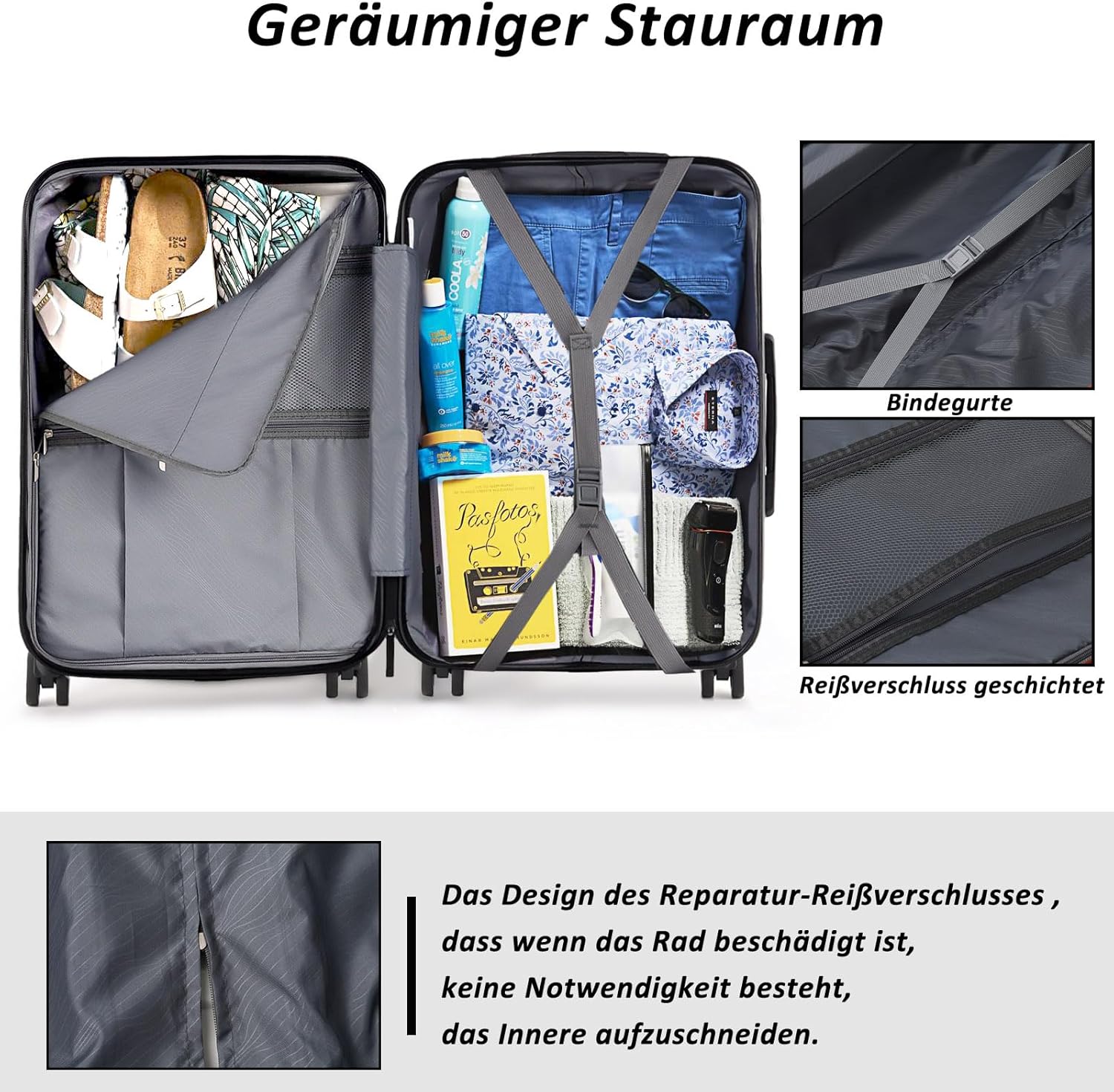 Der Koffer verfügt über ein um 306° 4xDoppel-Rollen, leises Raddesign, das es Ihnen einfacher und flexibler macht.