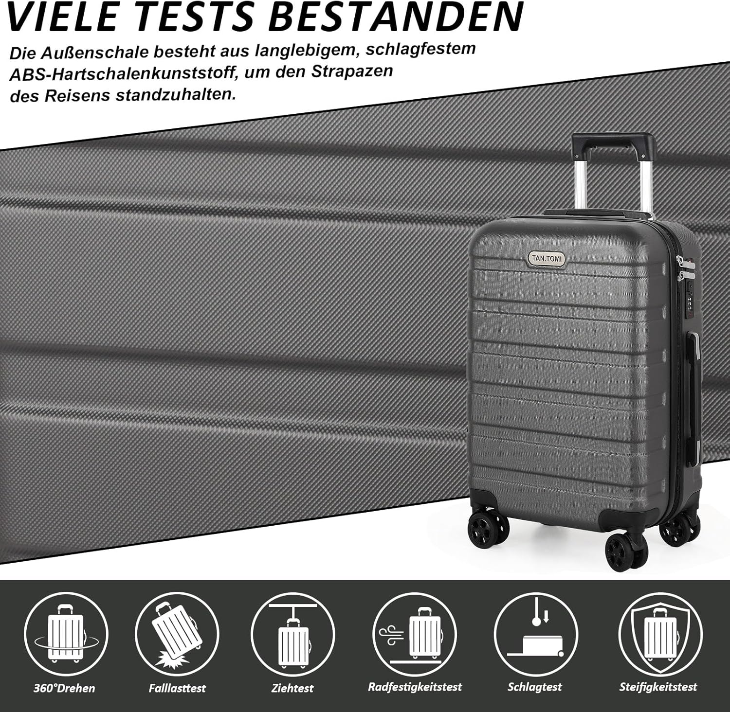 ABS Koffer Hartschale + Aluminiumgriff: Unsere luggage sind aus hartem ABS Material gefertigt, sie sind stark, leicht und kratzfest. Der Aluminium Teleskopgriff lässt sich der Koffer bei geringem Kraftaufwand schieben oder ziehen.