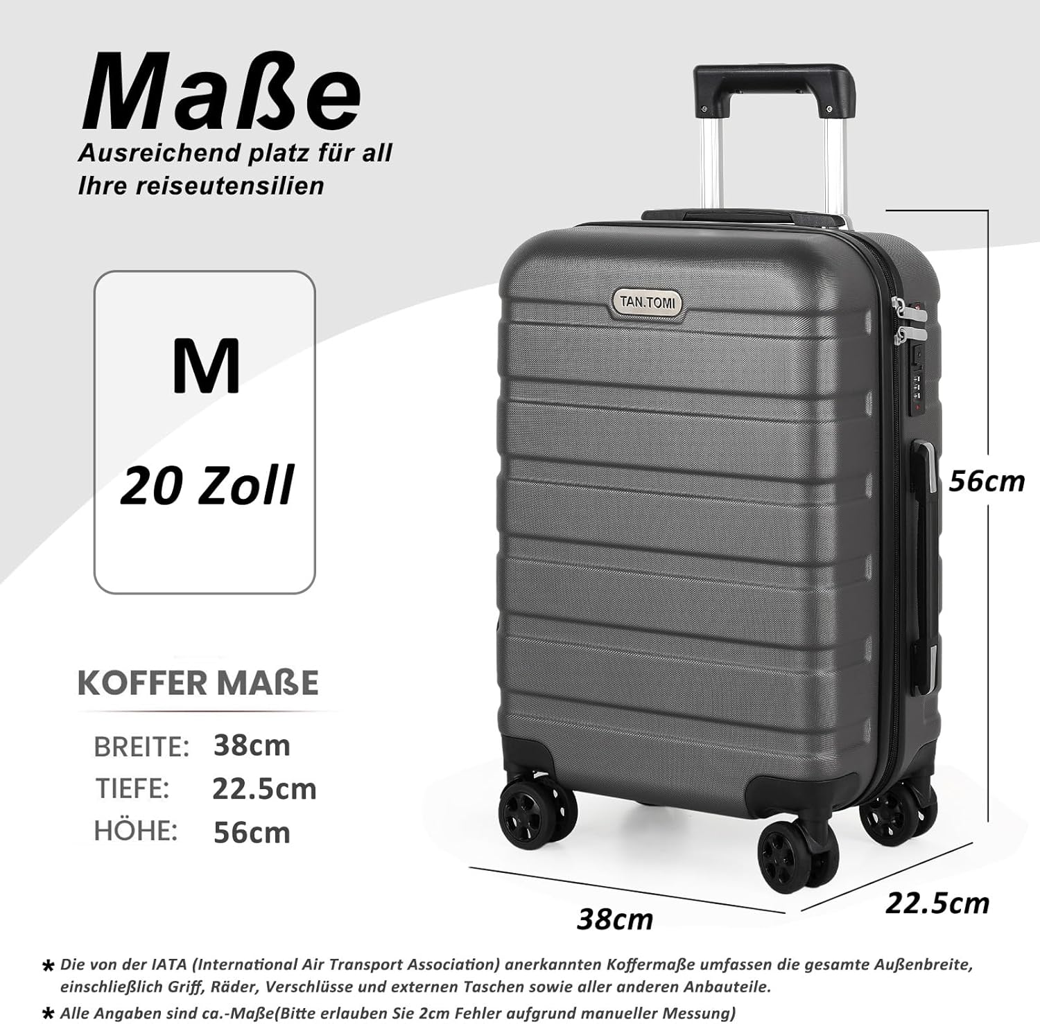 TAN.TOMI Koffer bieten die optimale Lösung für Ihre Reiseanforderungen. Die Koffer verschiedener Größen beeindrucken mit attraktiven Farben und Designs, was es Ihnen ermöglicht, unter den zahlreichen Koffern im Handumdrehen Ihren eigenen zu finden. Jeder Koffer verfügt über ein geräumiges Hauptfach, das sich mühelos mit einem leichtgängigen 2-Wege-Reißverschluss öffnen und schließen lässt. Zusätzlich bieten eine integrierte Reißverschlusstasche und Schultergurte mit Verschlüssen zusätzliche Organisationsmöglichkeiten. Das stabile ABS-Gehäuse, vier leichtgängige Rollen und ein höhenverstellbarer Teleskopgriff ermöglichen einen einfachen und reibungslosen Transport. Das Zahlenschloss sorgt für zusätzliche Sicherheit während Ihrer Reise. Ob Urlaub, Kurztrip, Geschäftsreise oder Weltreise, TAN.TOMI Hartschalenkoffer sind stets Ihr zuverlässiger Begleiter.