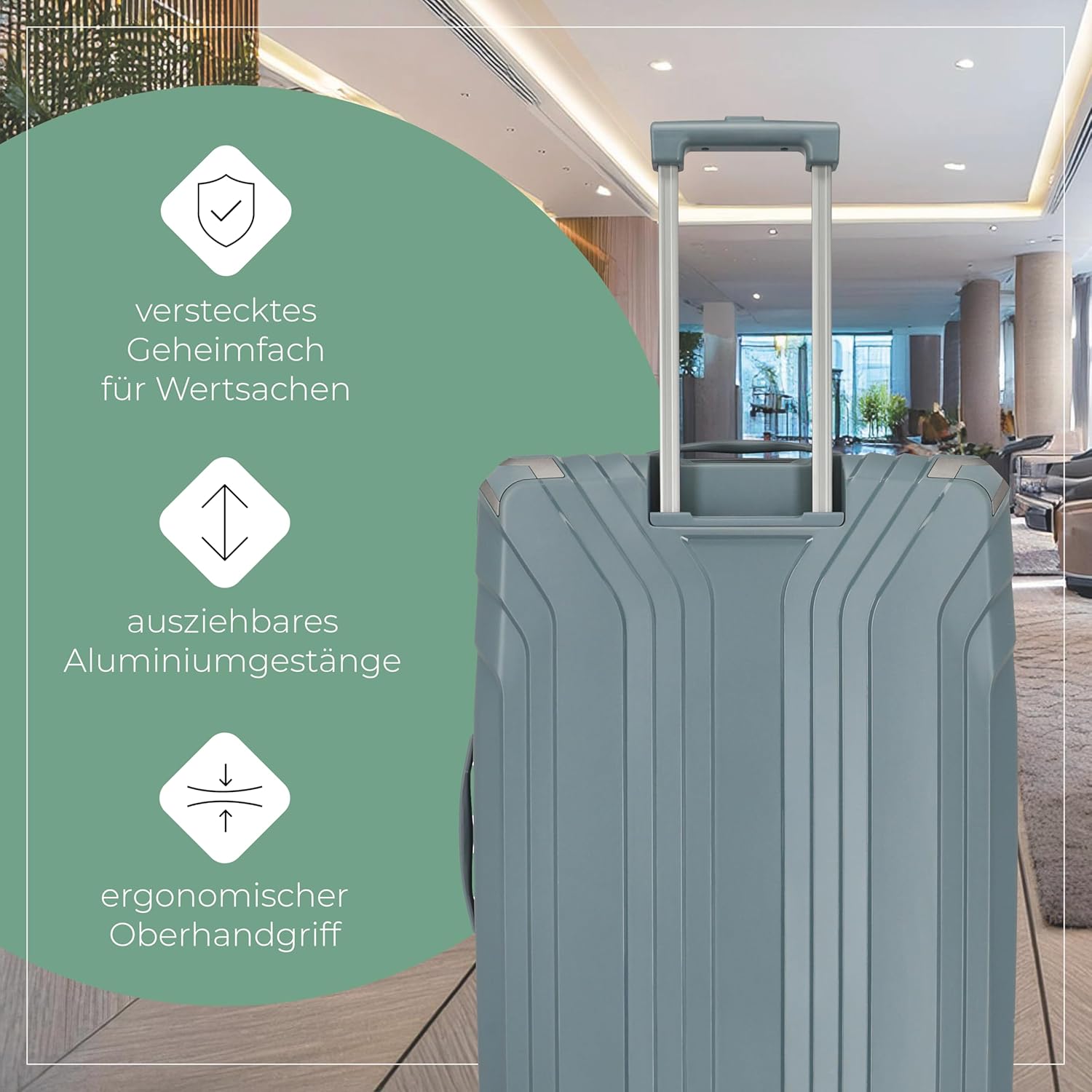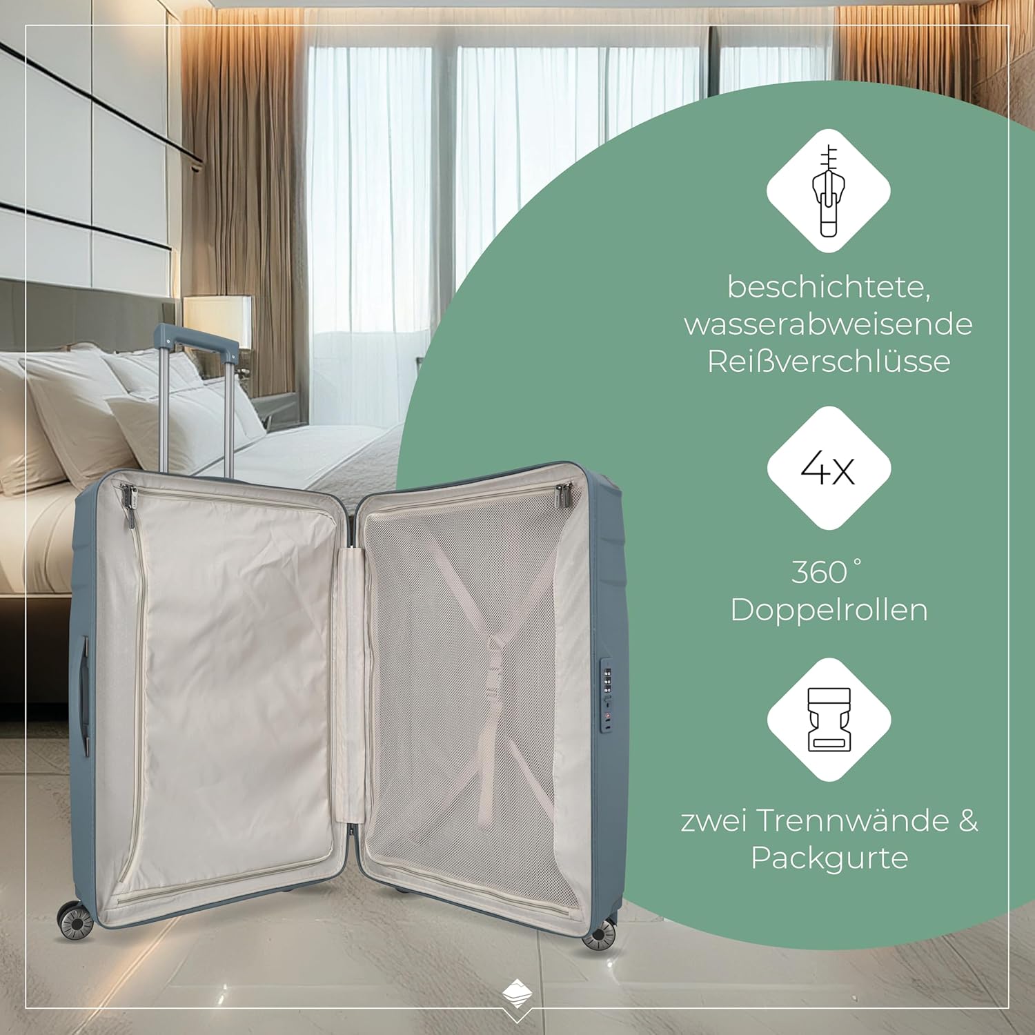 Super Hartschalen-Kofferset. Es ist jetzt nicht das absolut top hochwertige Kofferset, aber für den Preis absolut zu empfehlen. Sehr schön ist, das bei jedem Model beide Kofferseiten jeweils durch Trennwände mit Zusatzfächern verschließbar sind. Das hält Ordnung beim Aufklappen und sieht immer aufgeräumt aus. Die verstärkten Ecken sind sehr stabil, die Oberfläche ist allerdings anfällig für Kratzer. Die 3 Koffer sind ineinander stapelbar.