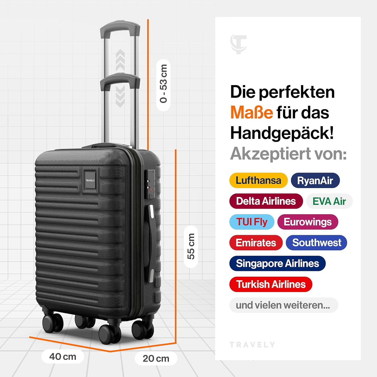 Schreibe die erste Rezension für „Travely Premium Handgepäck Koffer 55x40x20cm – passend für Ryanair, Lufthansa, Eurowings und co. I 36L Trolley Handgepäck mit sanften Rollen und praktischem TSA Schloss, Reisekoffer“