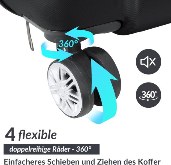 【360° drehbare Rollen】Der Koffer verfügt über 360° drehbare Spinner-Rollen, die es Ihnen ermöglichen, den Koffer in jede Richtung frei zu bewegen. Dadurch wird das Tragen des Koffers flexibler und bequemer, ohne dass Sie den Koffer anheben oder ziehen müssen. Die stabilen Spinner-Rollen sorgen auch auf unebenem Untergrund für einen stabilen Lauf und bieten eine bessere Manövrierfähigkeit und Komfort.